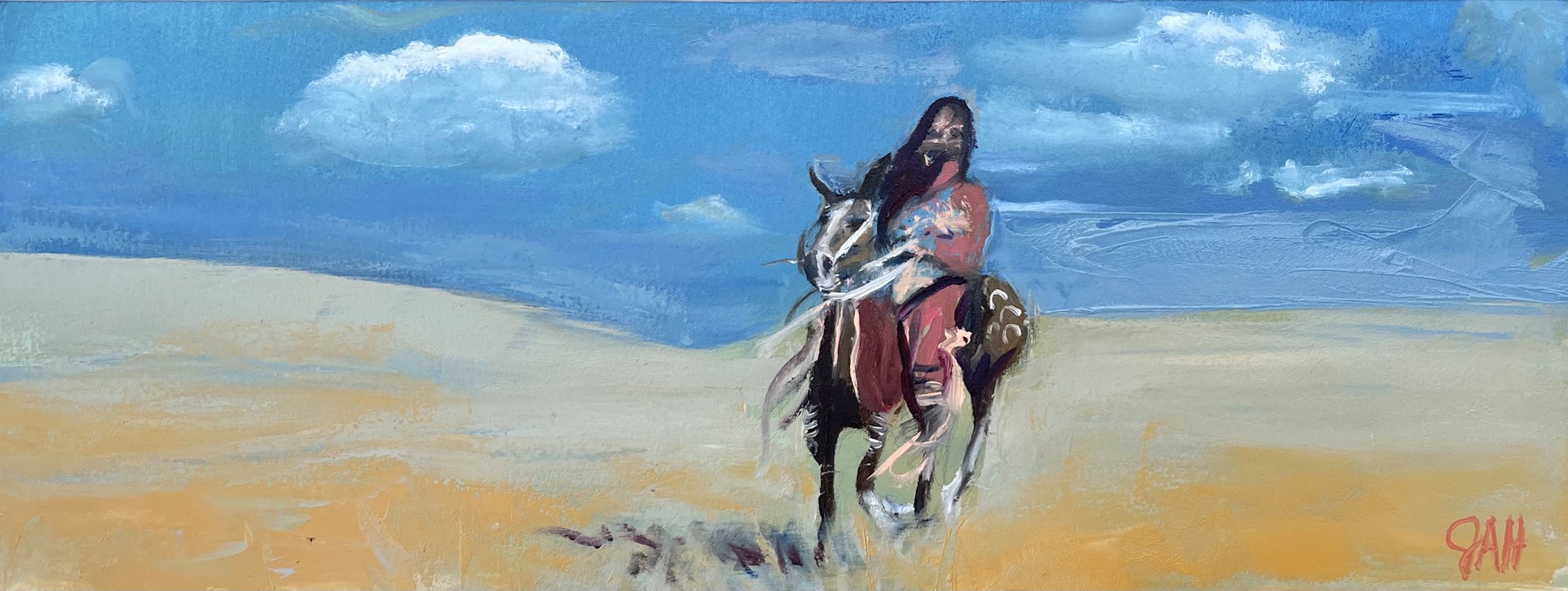 This is the first time placing a figure into a panoramic landscape. I like the imagery and plan to continue. Inspired by the movie Dances With Wolves. This piece is the character Wind in His Hair come to tell Dunbar who he is and that he is not afraid. You might know that this character later becomes Dunbar's best friend, but at this time he is confronting Dunbar.