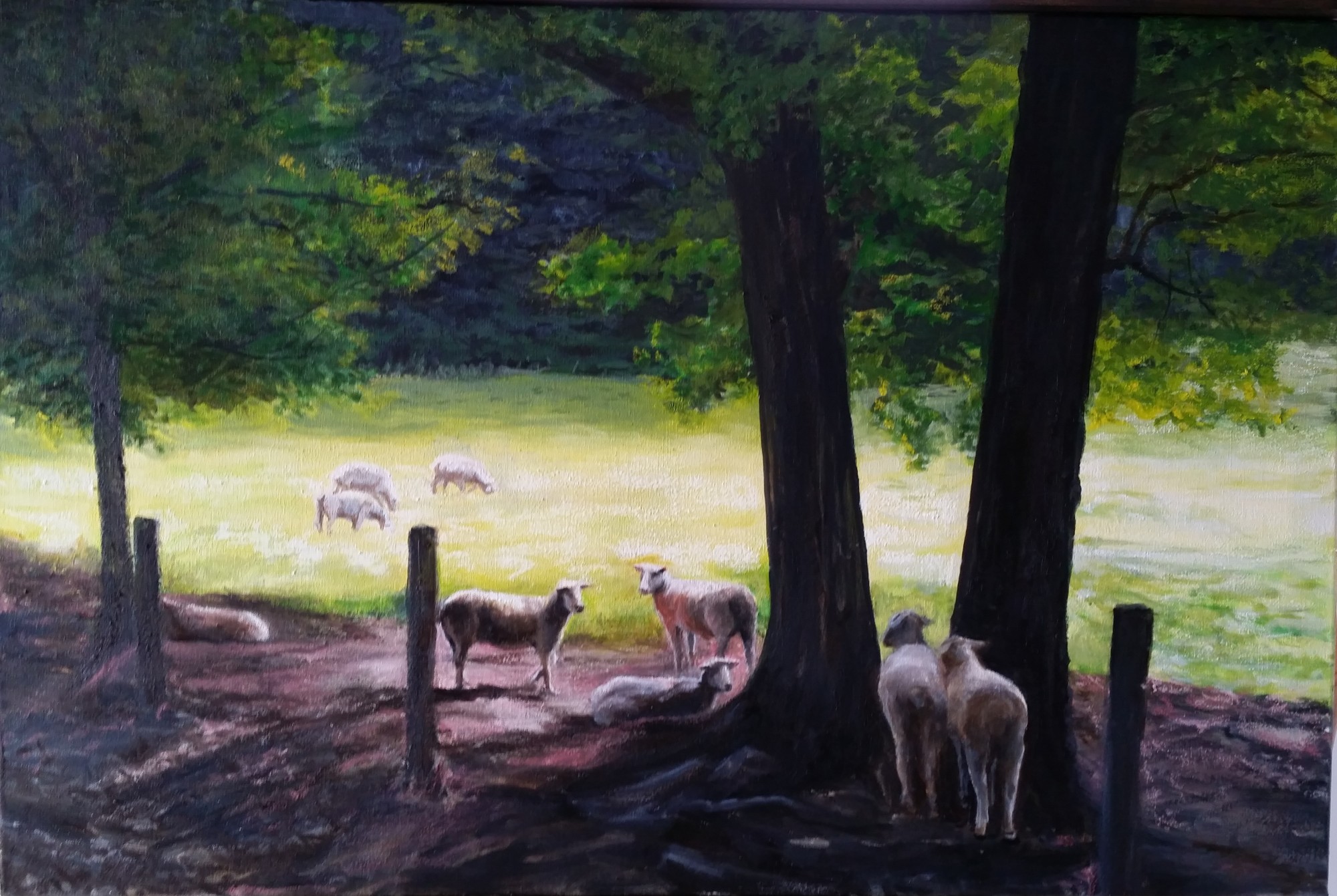 sun and shadow, small herd of sheep in shade under maple trees, on Fort Spring Road in Sinks Grove, WV