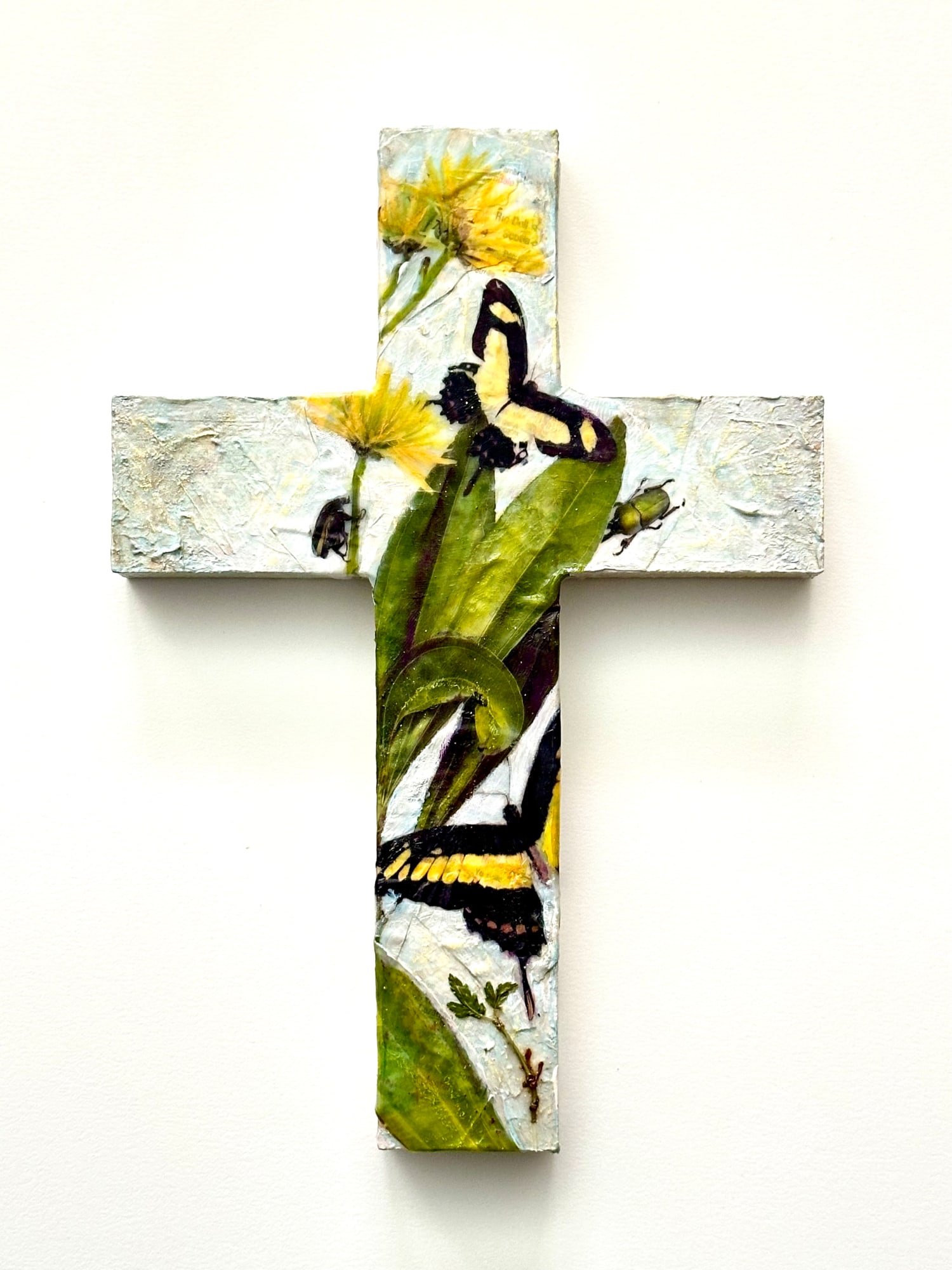 • Photo transfer, acrylic, color pencil, wax pastel, ephemera & dried pressed plant on wood