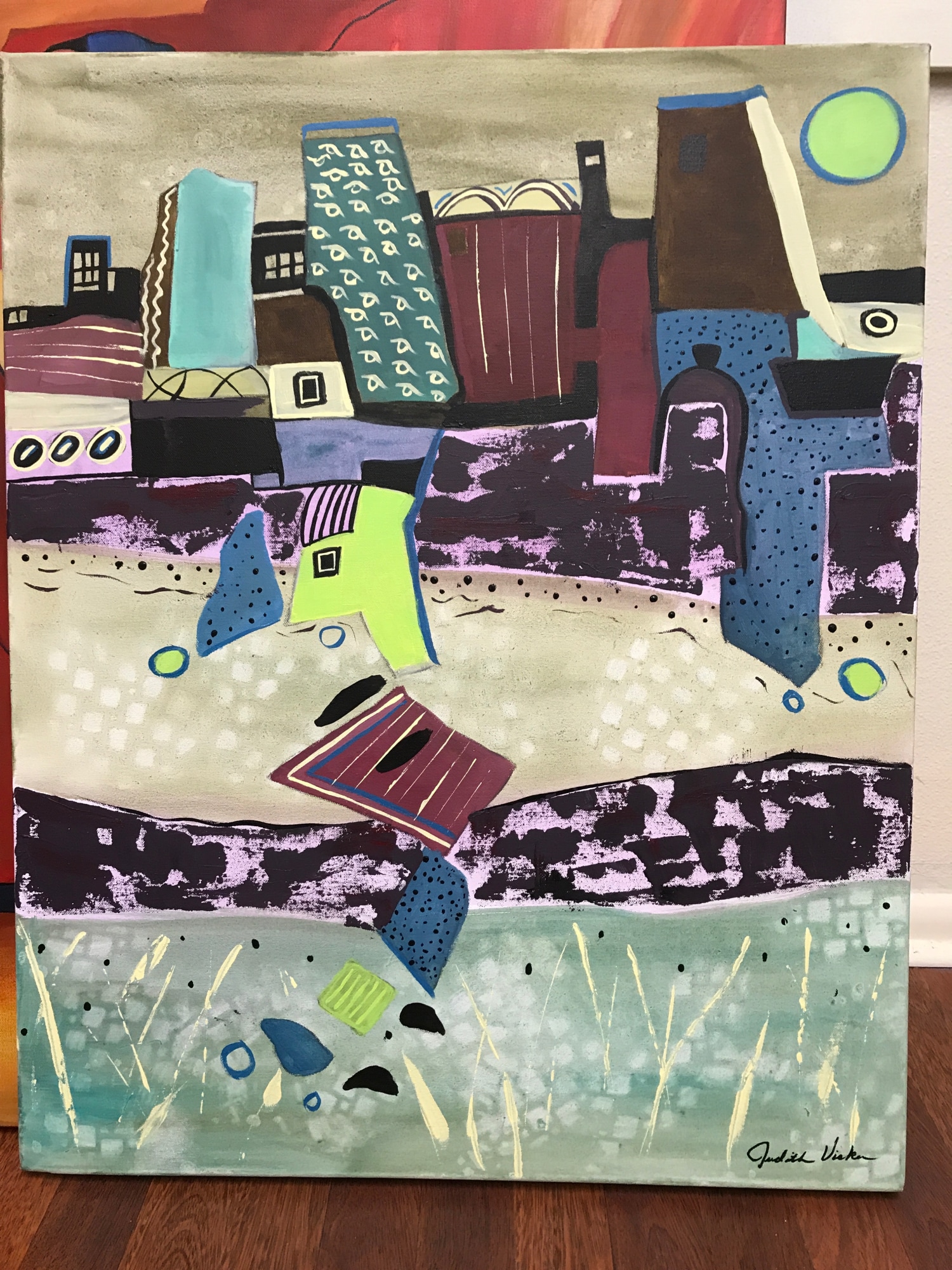 My City-scape series includes patterns and abstracted forms. This piece is a variation from my usual primary color but with inclusion of the time green it wakes up to give it my style.