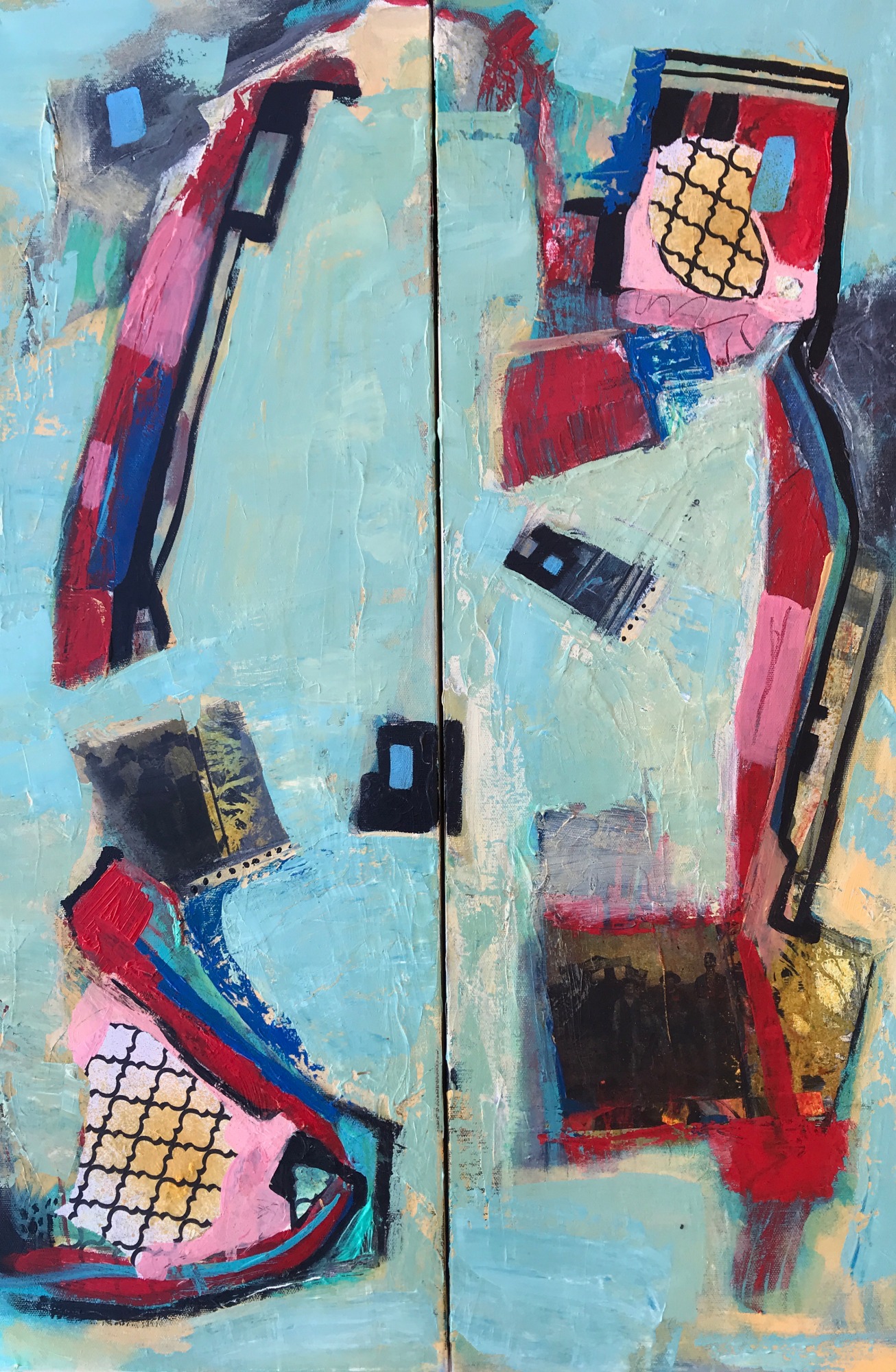 Diptych with non-representational shapes. Finished with acrylic resin.