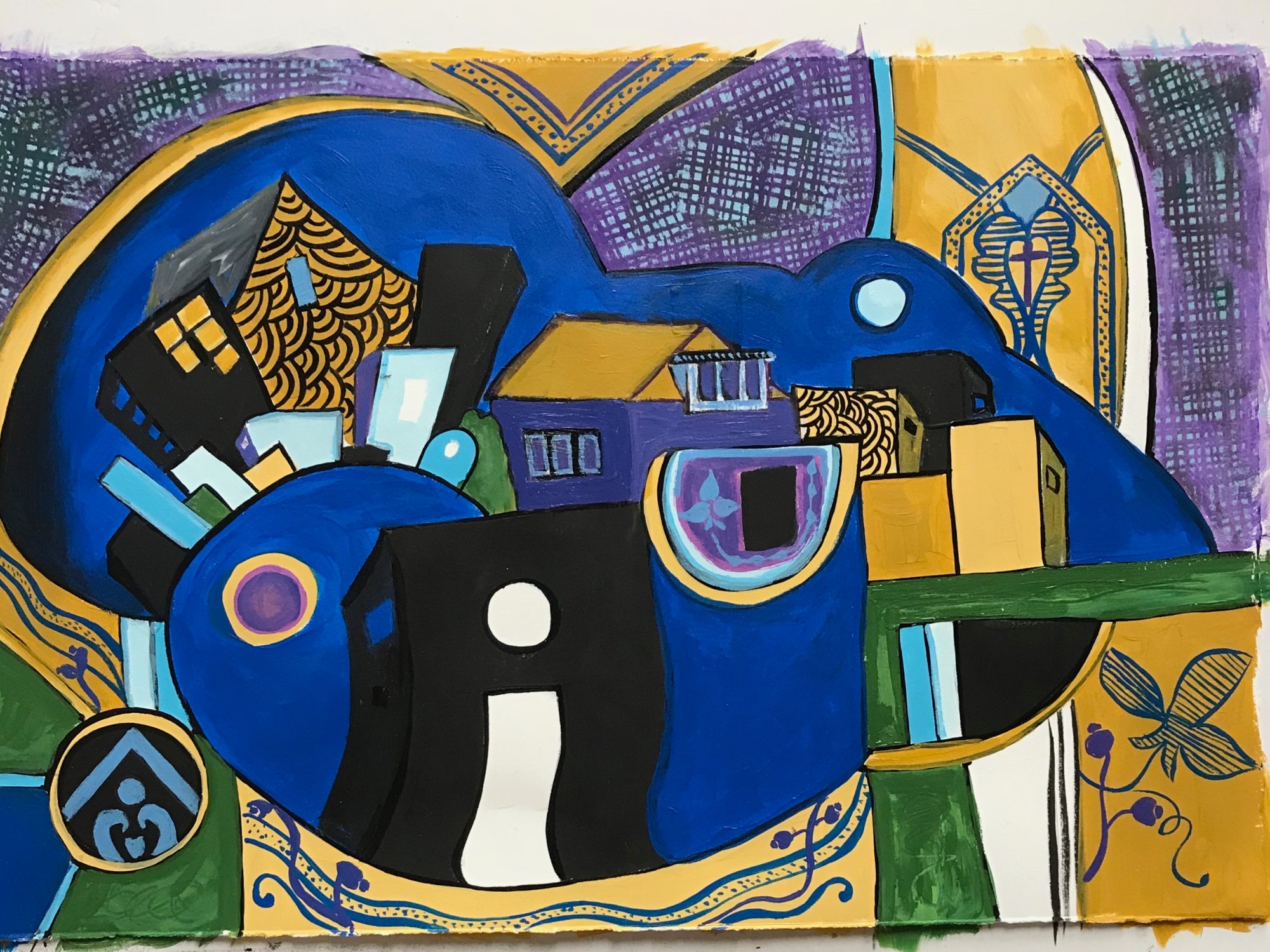 Yellow Submarine contains patterns and colors that entertain the eye of the viewer. Painted on paper, it will be attached to a panel and coated with a resin.