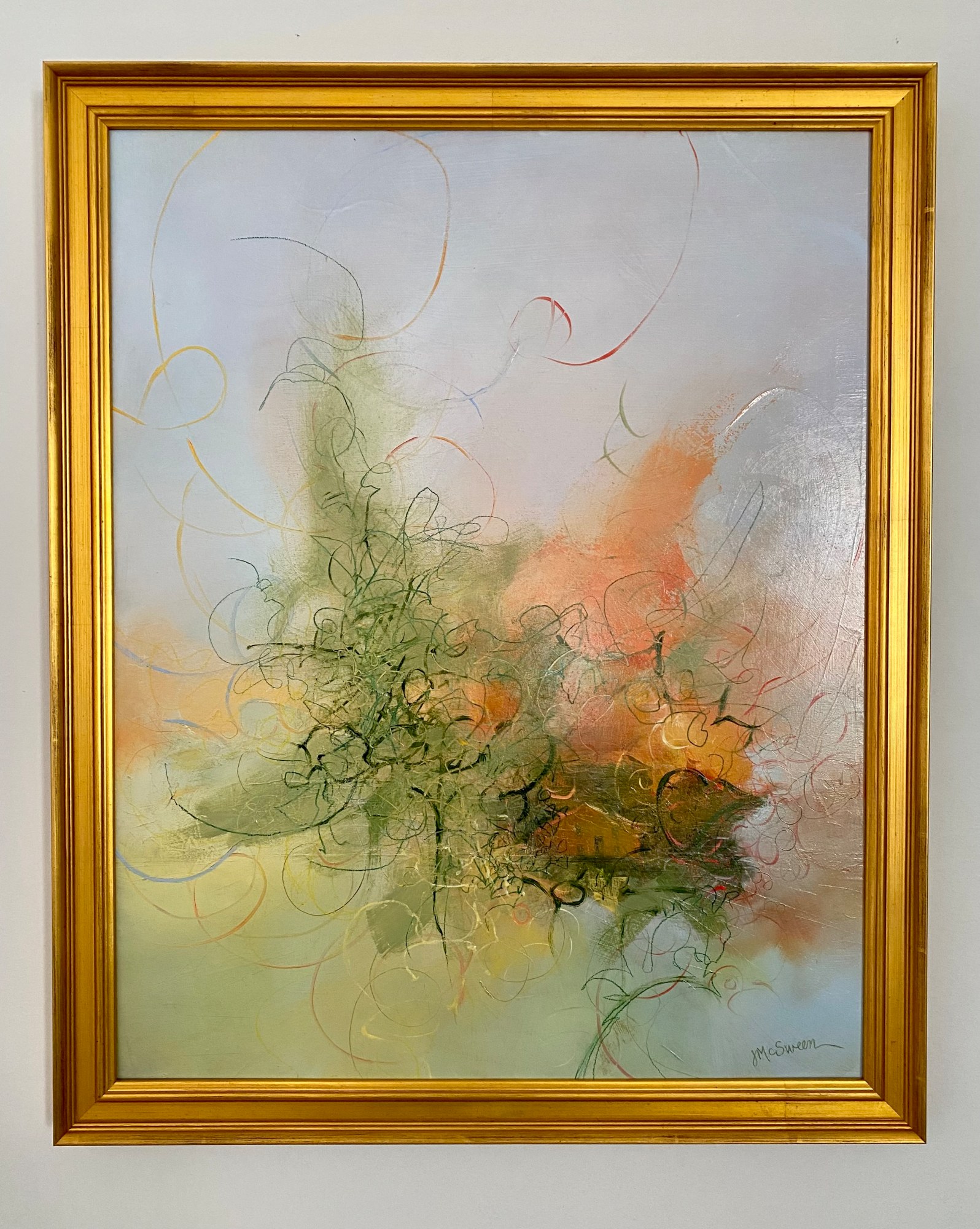 I painted a quiet landscape with a pastel sky and set it aside for a few days. When I looked at it again, I didn't feel satisfied with it. The painting had so much more to say. I had to let go of what was there and paint with more freedom. When I pushed out the "it should look like..." thoughts by painting over parts of the scene with fresh color and lines, it swirled into focus and came to life. The painting's a great metaphor for clearing your mind and starting fresh, for not always knowing what you're looking for until you find it, and for trusting your instincts.