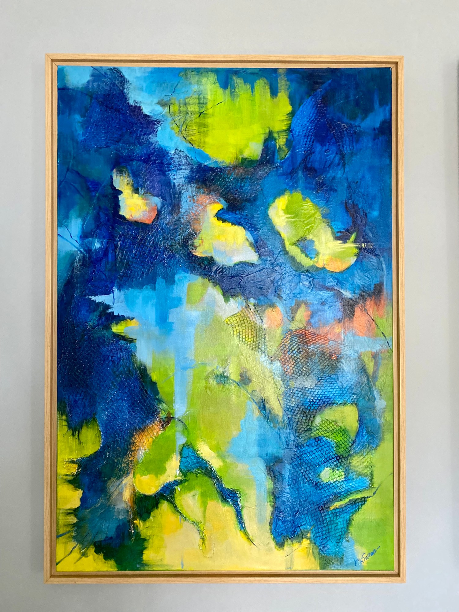 Painted on textured canvas and presented in a modern maple floater frame.