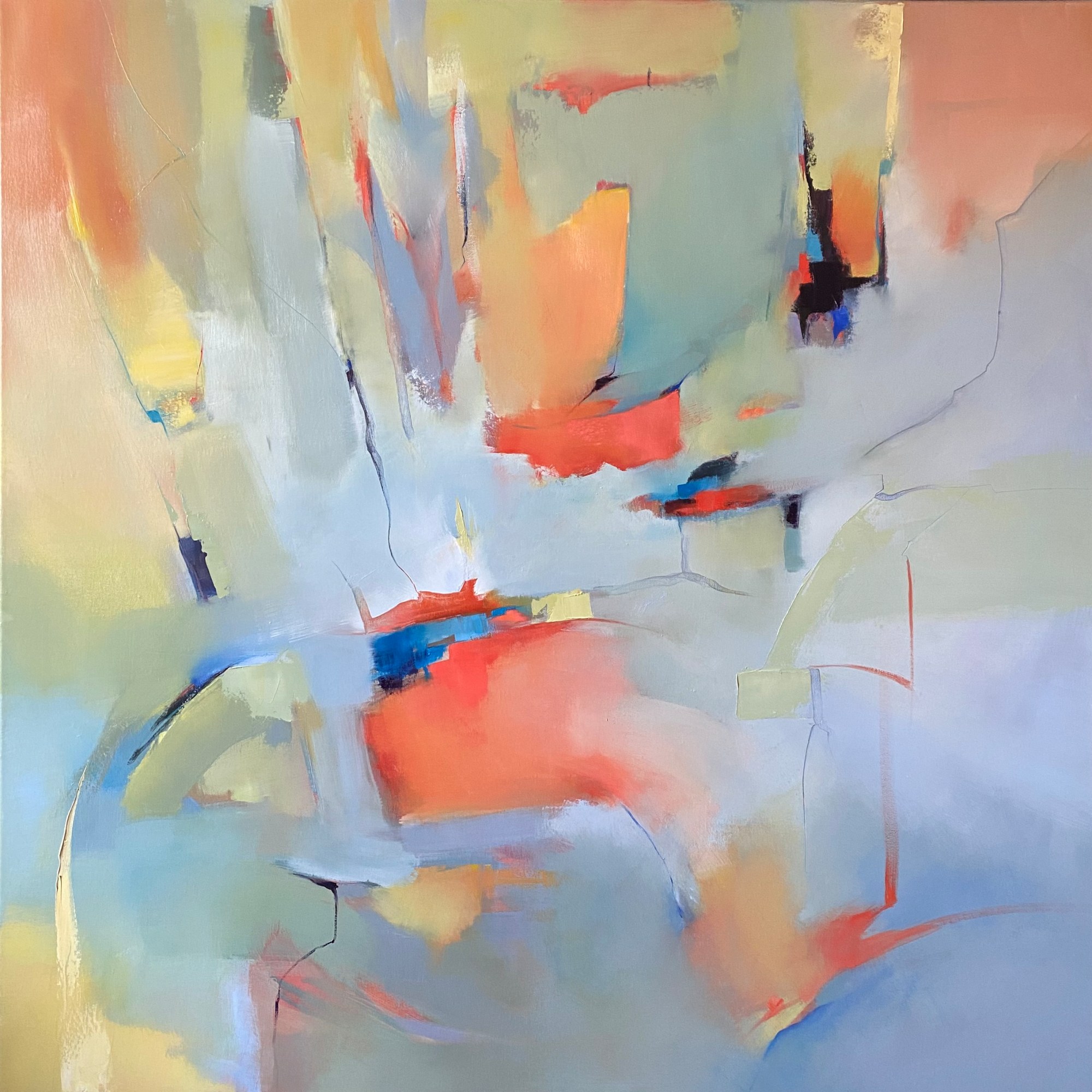 "This painting is an expression of abandon and joy, dance and happiness... I'd drawn an Adirondack chair we have encircling a backyard fire pit, an outdoor gathering place my family members enjoyed throughout our pandemic lockdown. To me, that chair drawing represented joy in the midst of the unknown and hope for brighter days. I was playing with the lines and shapes in the drawing when a new composition emerged. The open spaces and bright colors create a celebratory feel. I felt that in the free sweeping movement of my brushwork and in the surprise textural details I added with my palette knife."
