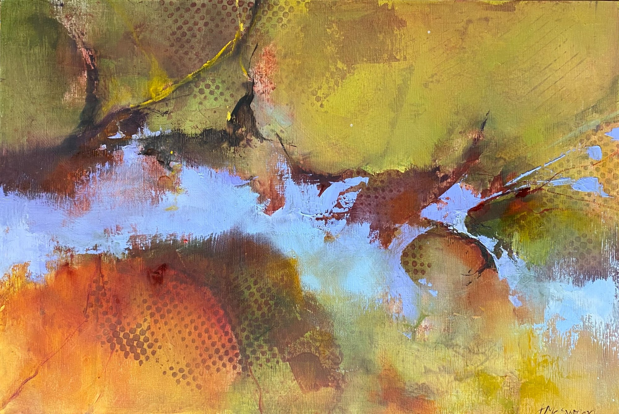 The title Flow With It comes from the concept of working into and through an abstract piece, making decisions as the image emerges. One technique I use to create something non representational is to begin with a patterned ground and paint freely around and over areas. Sometimes it’s just what’s needed to get going. The original ground may end up obscured beneath a discovered composition or it may become integral to the piece- as it is in this painting.