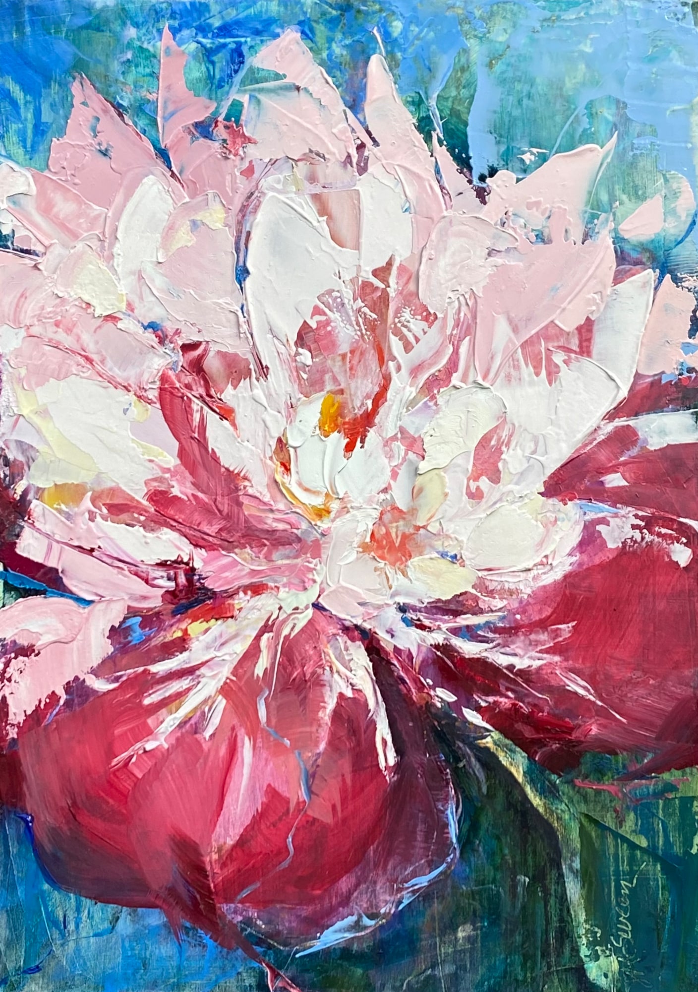 Oil on wood with varnished finished sides, framed in modern silver and black floater frame