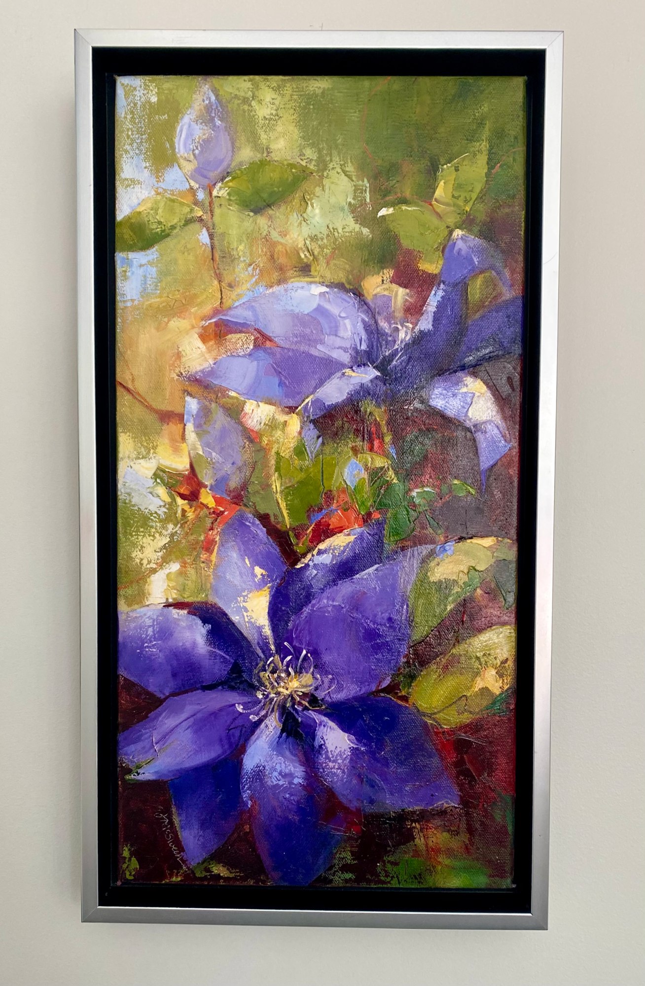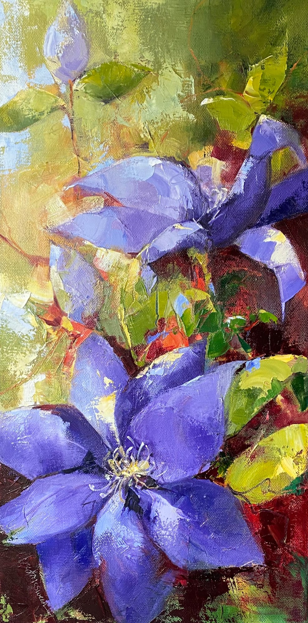 I binge painted the beautiful purple clematis when they bloomed in my backyard—every day for nearly two weeks This is the finale piece. It’s fitting because I used one of the first photos I took to paint the buds. I painted the rest of it as an accumulation of my first three smaller pieces-with the shapes and colors and shadows of the flowers still so fresh in my mind- and in my hands. By the time I finished it, the petals faded and fluttered to the ground.