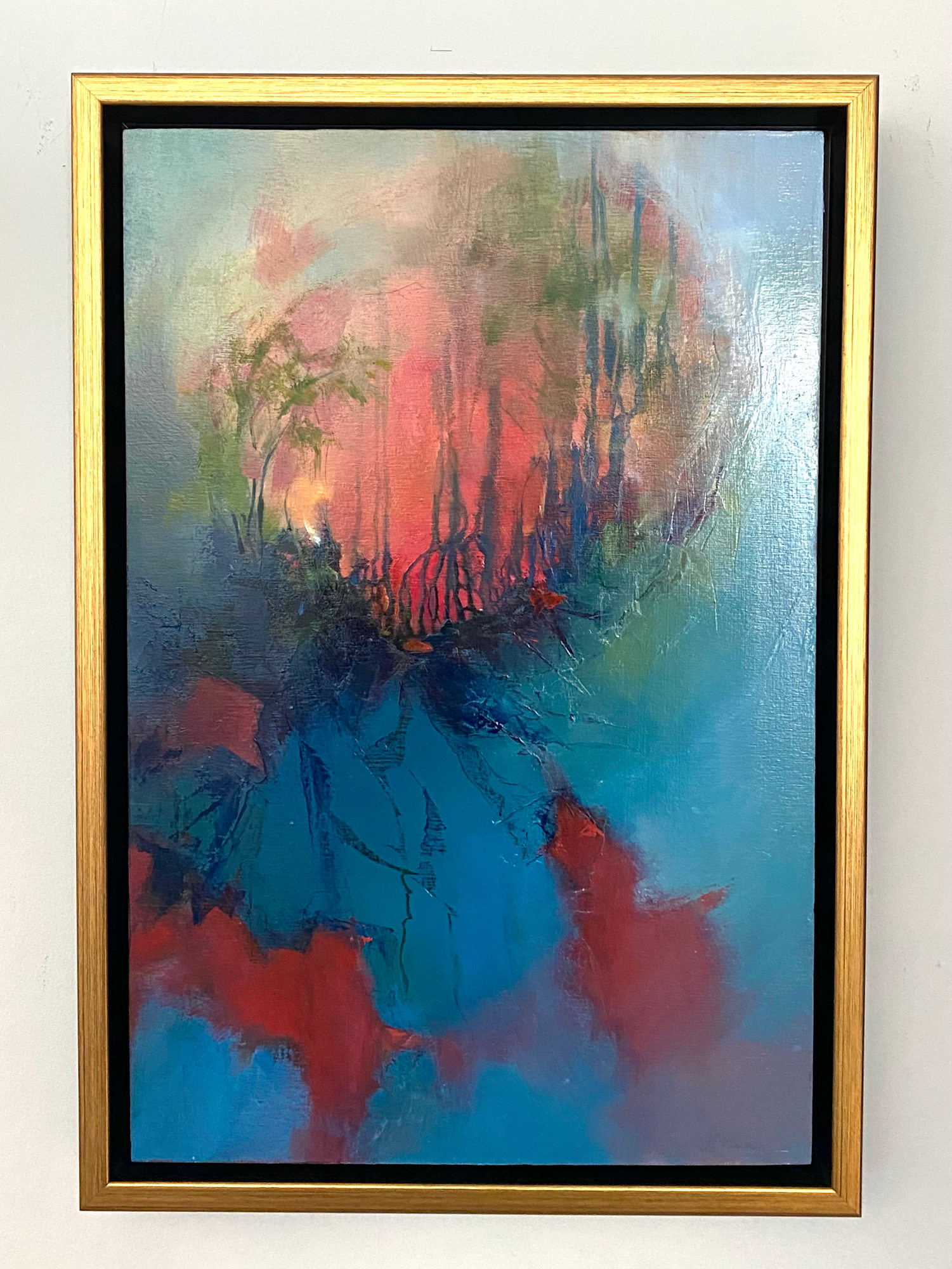 Paint has so many possibilities and artists experiment with it to achieve specific effects. I wanted a misty lost feeling for my forest scene and used different techniques to fill the opening with these trees. That was planned; however, the area leading into it was a found image. I saw roots and paths and light beneath—suggesting the "way in" is an interesting as the destination and that exploring all those ways in is even more intriguing.