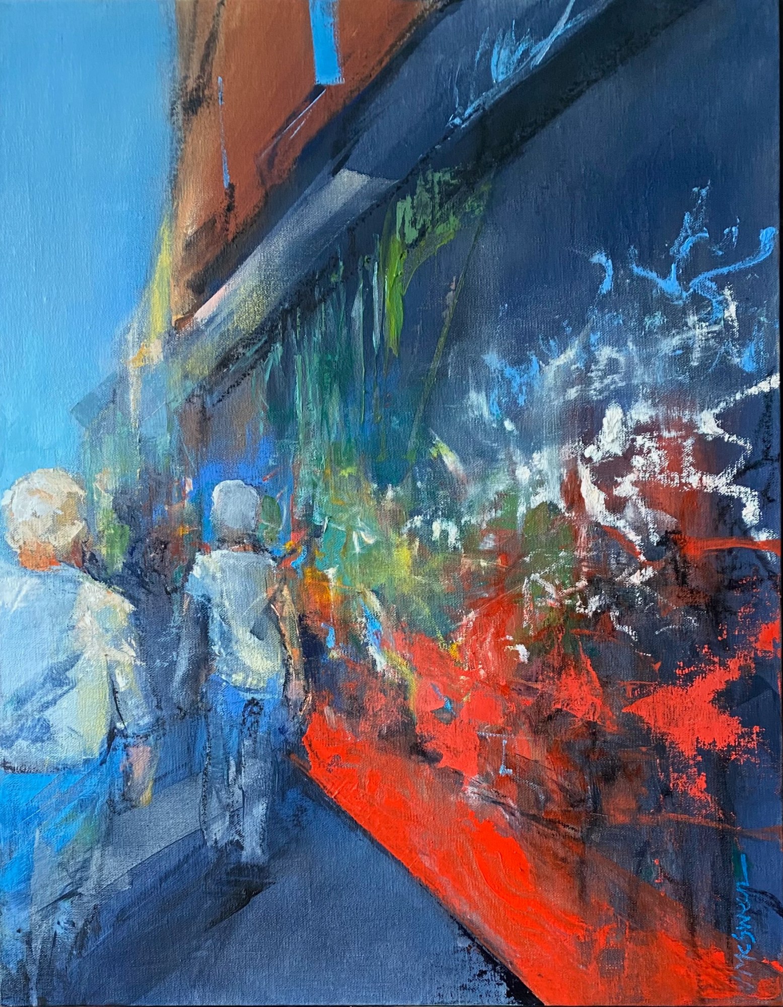 From a photo I took of us wandering the Dublin streets. We went down side streets where the buildings were canvases of color and street musicians entertained us with harps and keyboards.