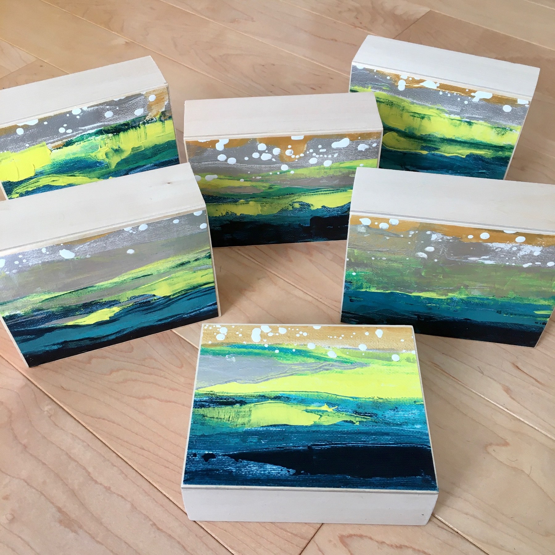 They are acrylic on canvas-textured paper mounted on gallery-depth (1.5") wood boards. Some of the paint has a metallic lustre. Sides are left to show the natural wood and they are finished all over with a clear acrylic varnish to protect the colours from fading, dust and UV light.
