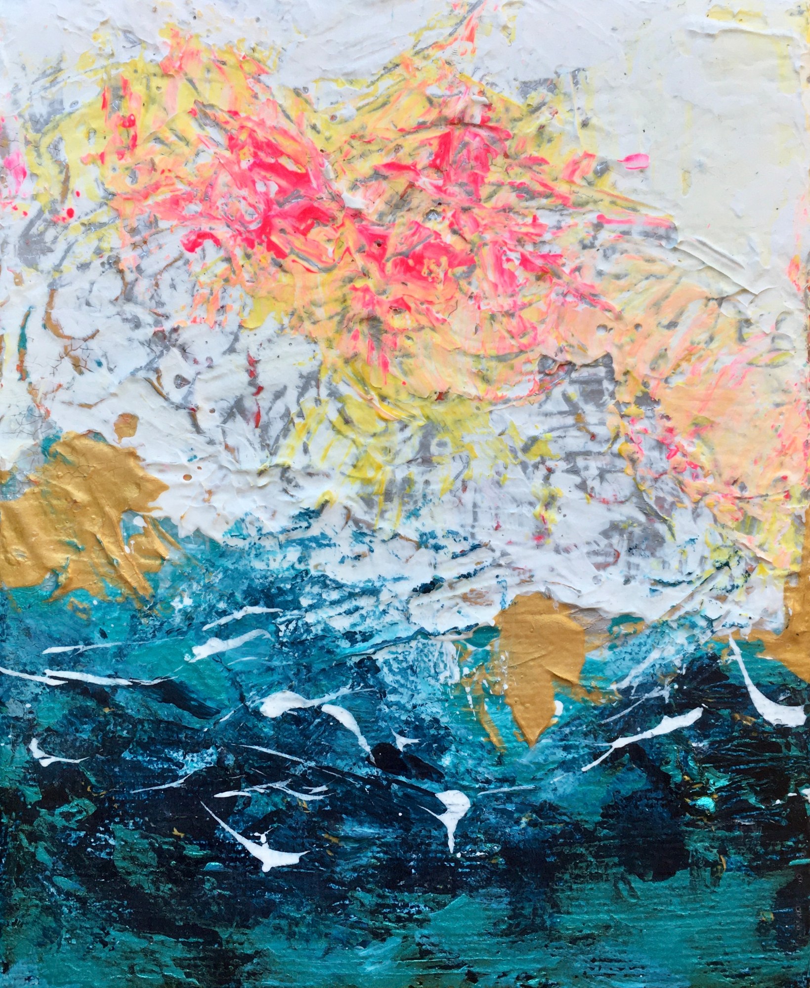 MessageThese three little paintings evoke the spray of the waves on a day when the sun is neon bright. Some of the paint has a metallic lustre.