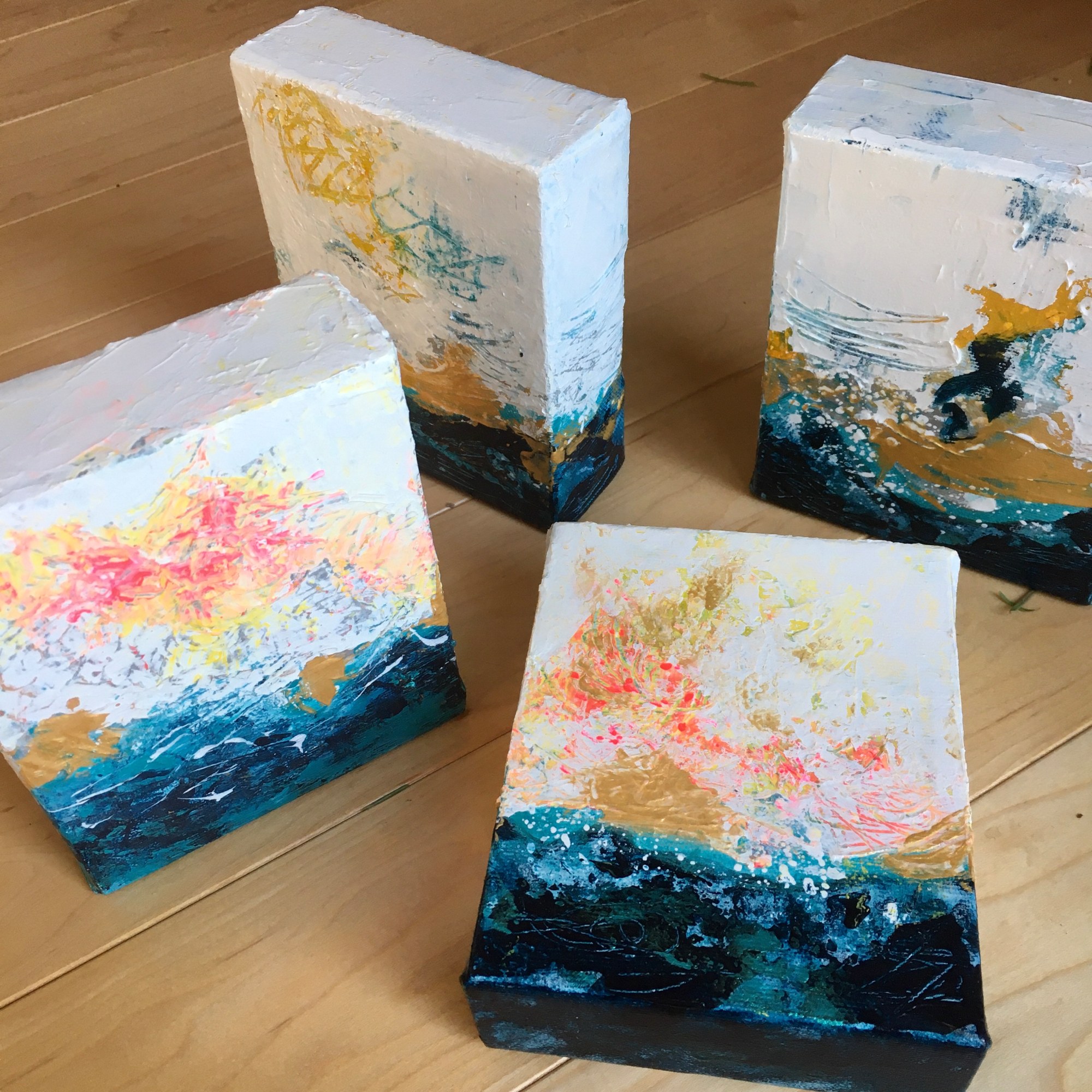 MessageThese three little paintings evoke the spray of the waves on a day when the sun is neon bright. Some of the paint has a metallic lustre.