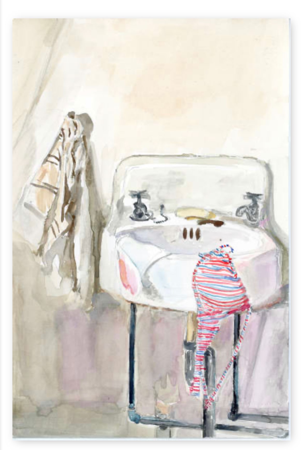 Vintage wall sink with red, white and blue bikini draped over the edge. Purely an American girl summer. 7.25 x 5.25 inches including white border, printed on premium matte paper.
