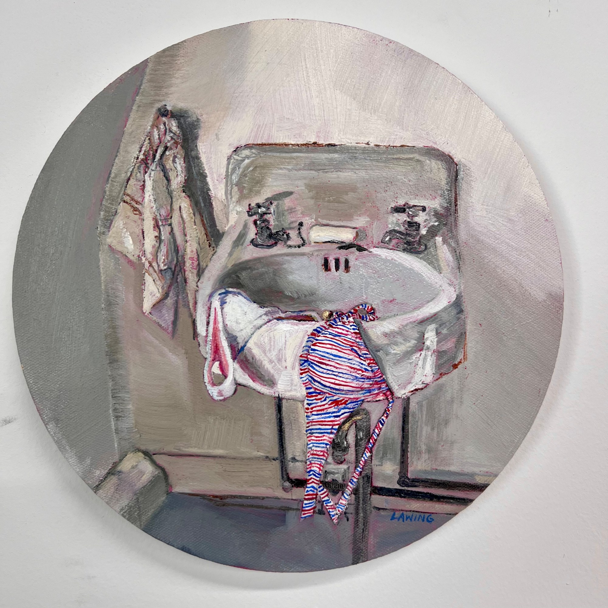 Vintage wall sink with red, white and blue seersucker bikini draped over the side. Americana at its finest! Oil on canvas. By Julia Lawing.