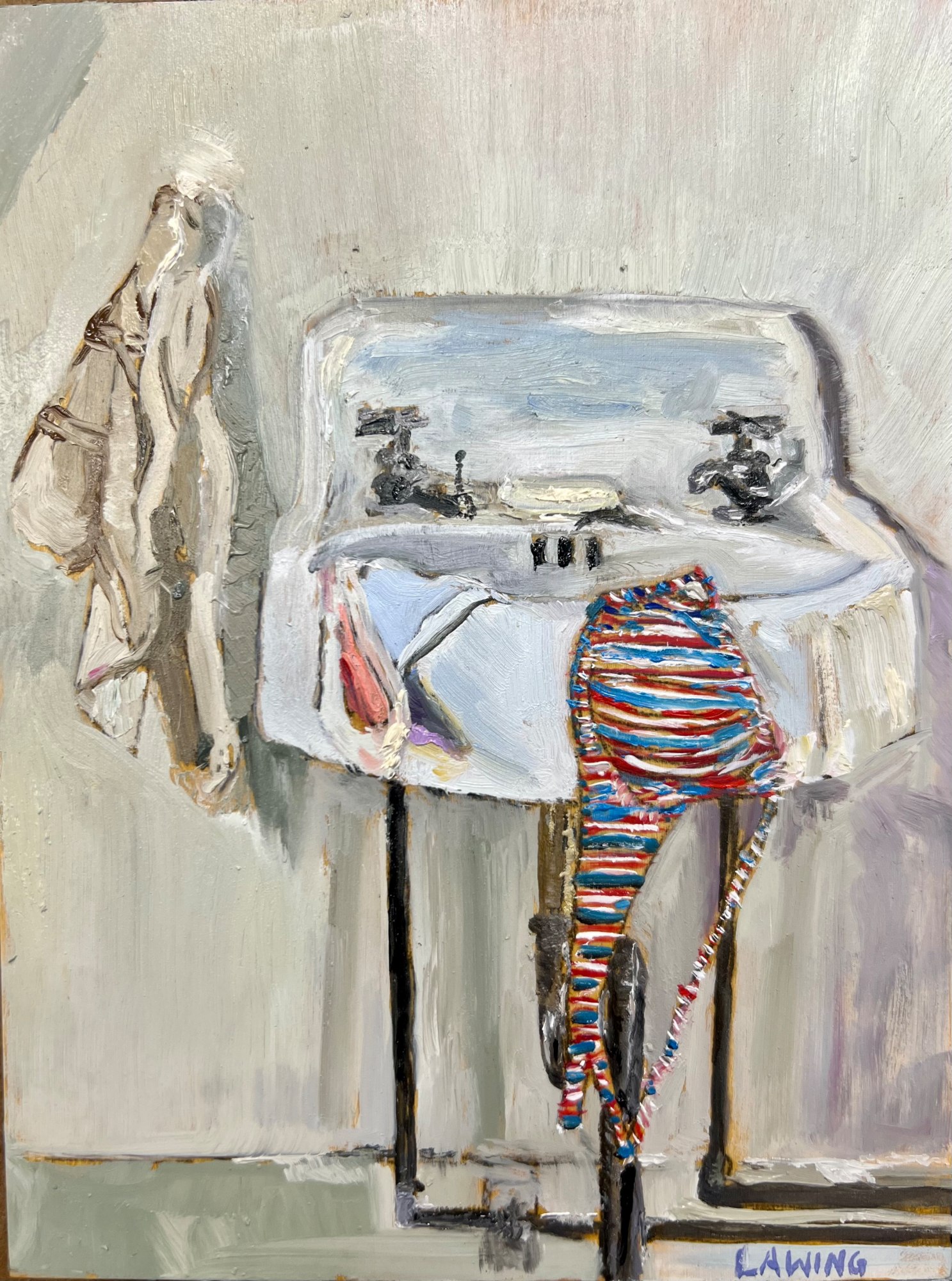 First in sink series. Vintage wall sink in my daughter's living quarters for the summer, the third floor of the Block Island Historical Society. Oil on 1.5 inch deep cradled wood panel.