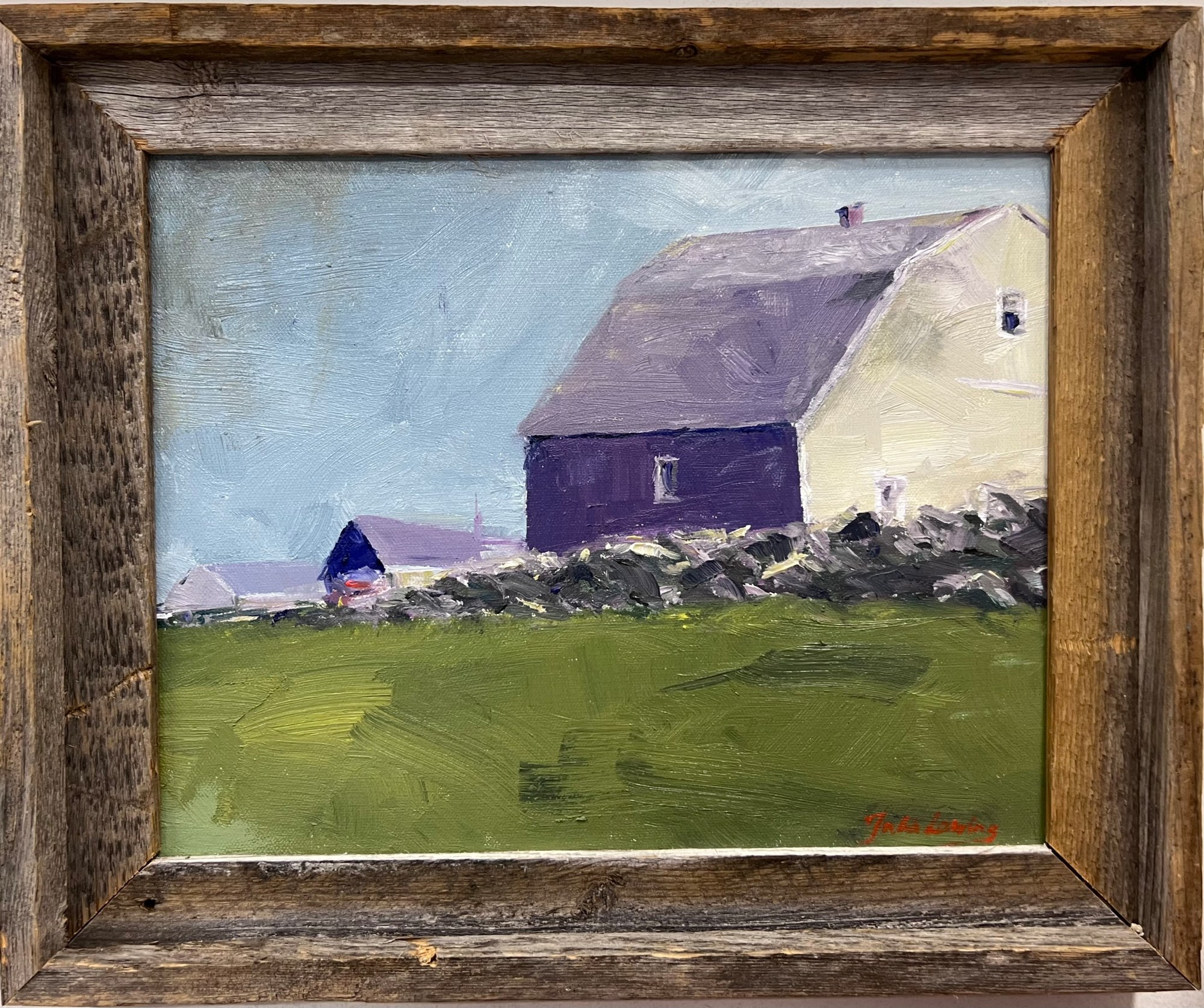 Block Island's iconic Mitchell Farm barn, oil on canvas, framed in weathered gray wood frame.