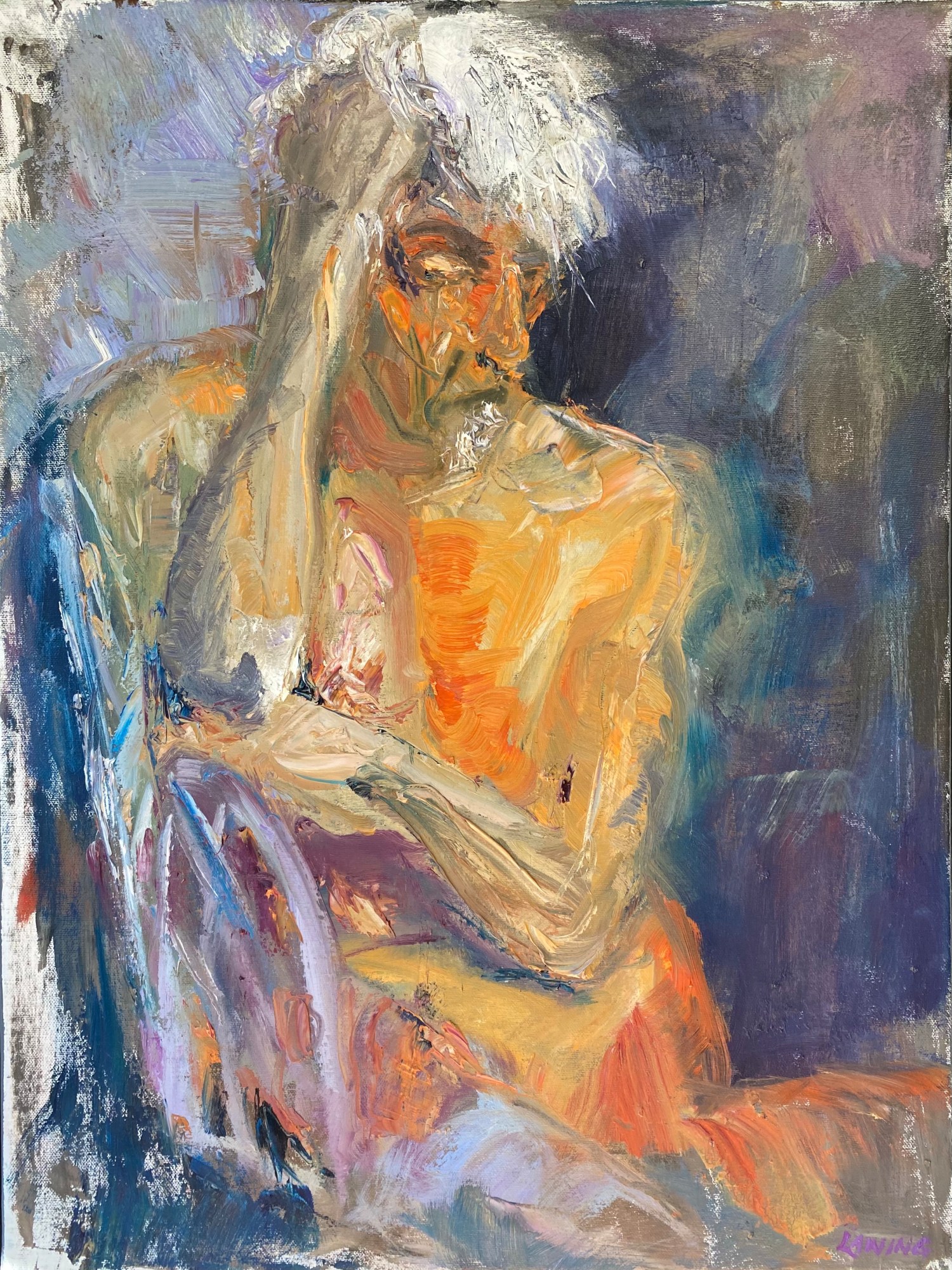Seated male model. Oil on canvas. Framed in black floater frame.