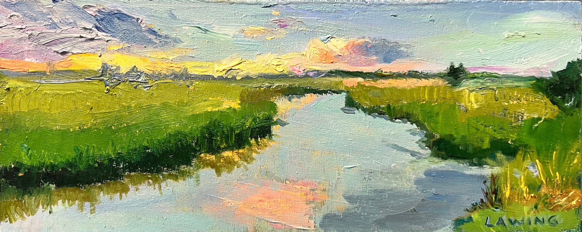 Southeastern marsh under colorful clouded sky. Oil on wood panel.