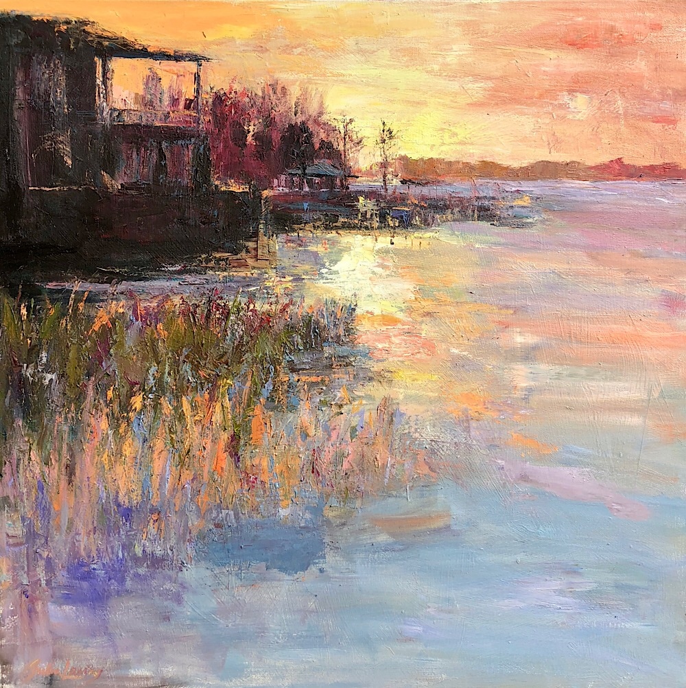 Sunset view of a house and its dock on the intercoastal waterway between the Old Pitts Street Bridge, in Mount Pleasant's Old Village, looking across to Sullivan's Island.
