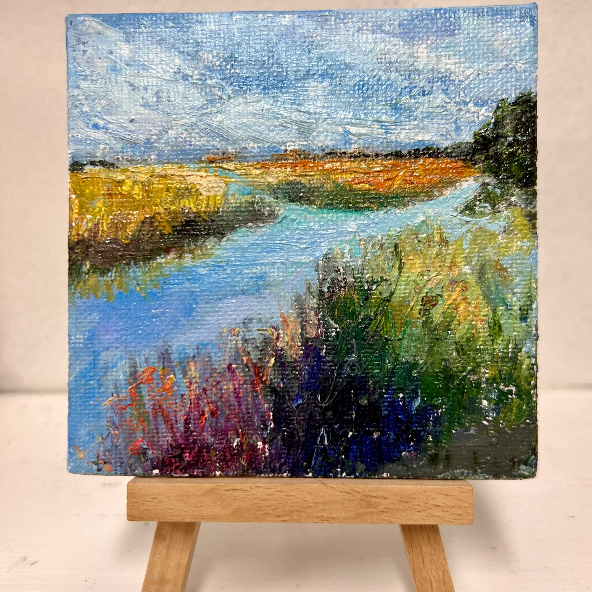Miniature marshscape oil painting on miniature canvas panel with mini wooden easel