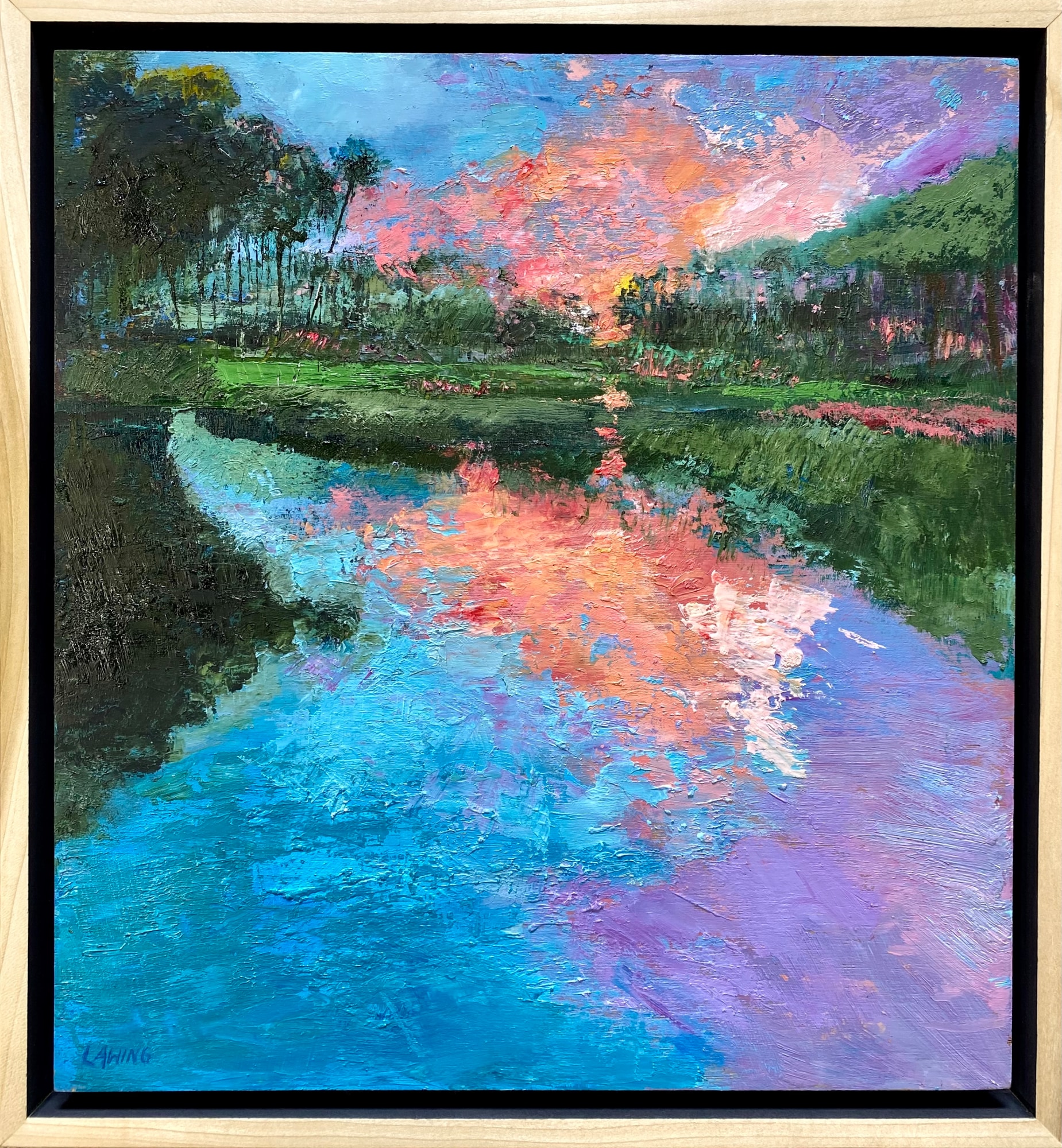 Glowing sunset, over St. Simons Island Club (Sea Island's Retreat golf course) lagoon. Oil on wood panel in custom natural wood floater frame.