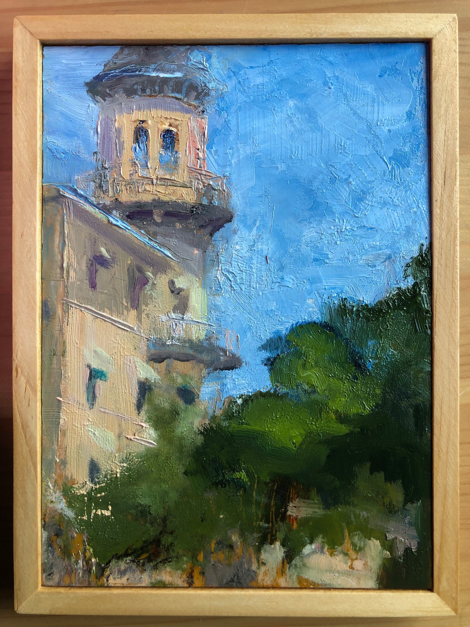 Jekyll Island Club Hotel’s profile of the famous turret. Oil on shellacked wood panel in handcrafted wood floater frame, natural finish. Done en plein air.