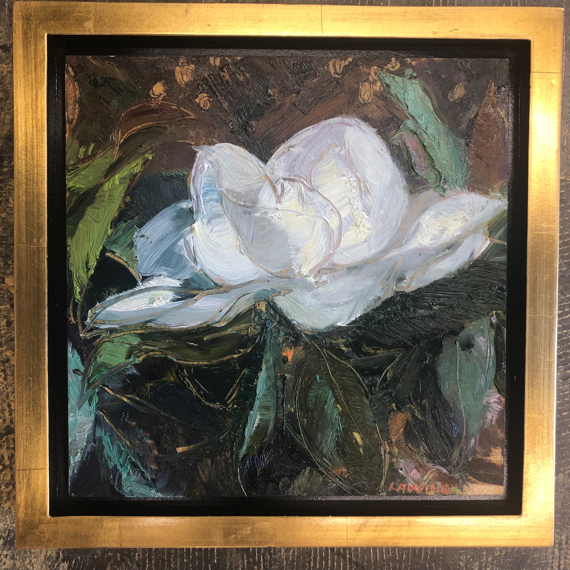 It’s summertime and the magnolias are in full bloom. Oil on wood panel, in gold leaf floater frame. Garden Party collection.