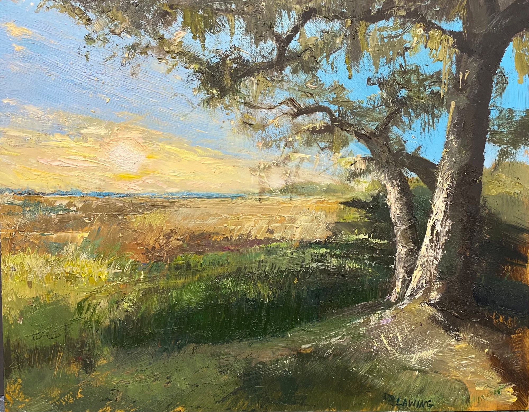 Live oaks by the marshes edge, adorned with Spanish moss and backlit by the sunrise. Oil on cradled wood panel.