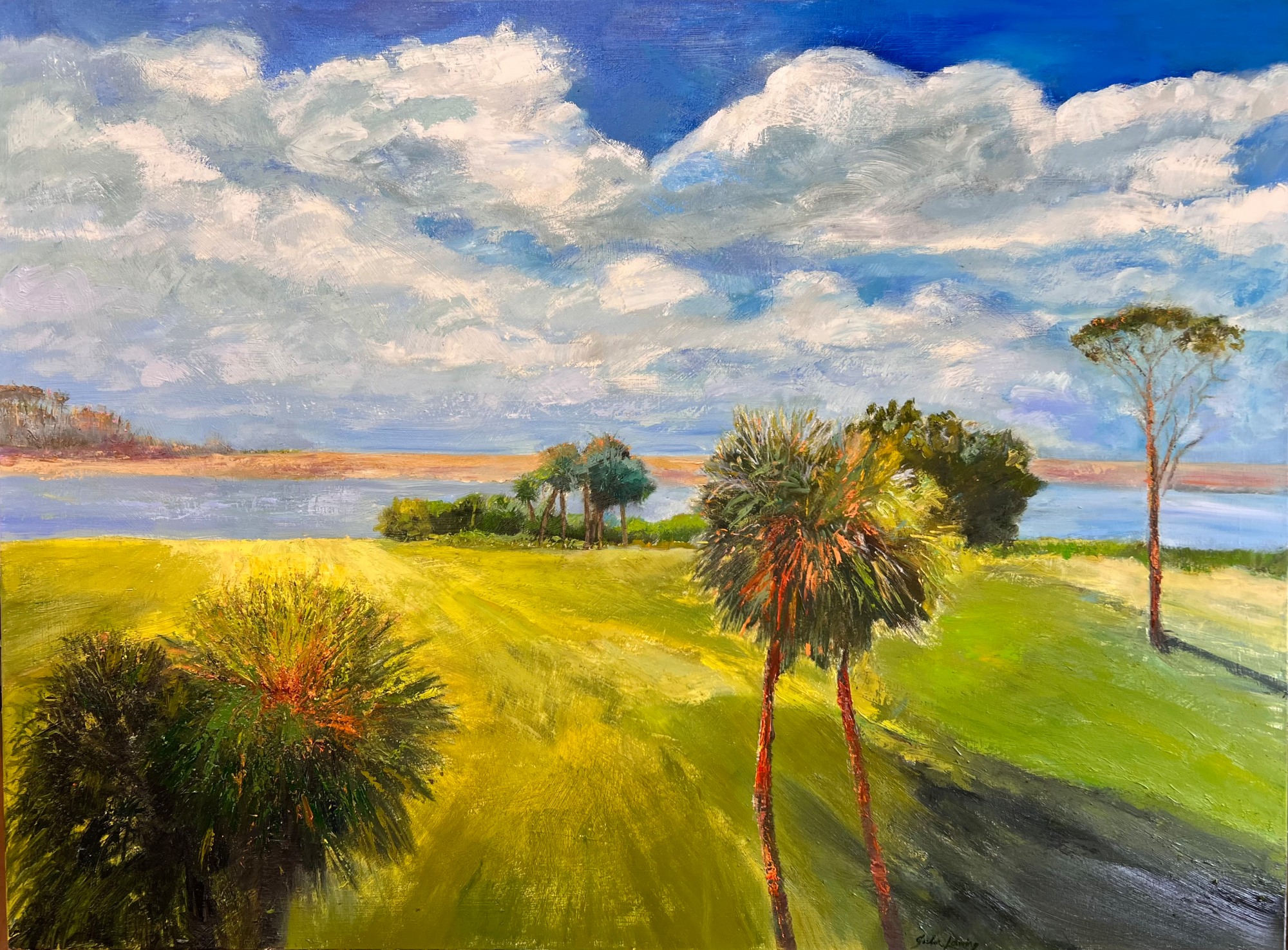 Bird’s eye view of the sound and between Fripp Island Resort Ocean Point golf course and Hunting Island. South Carolina coast. Oil on canvas, private commission.