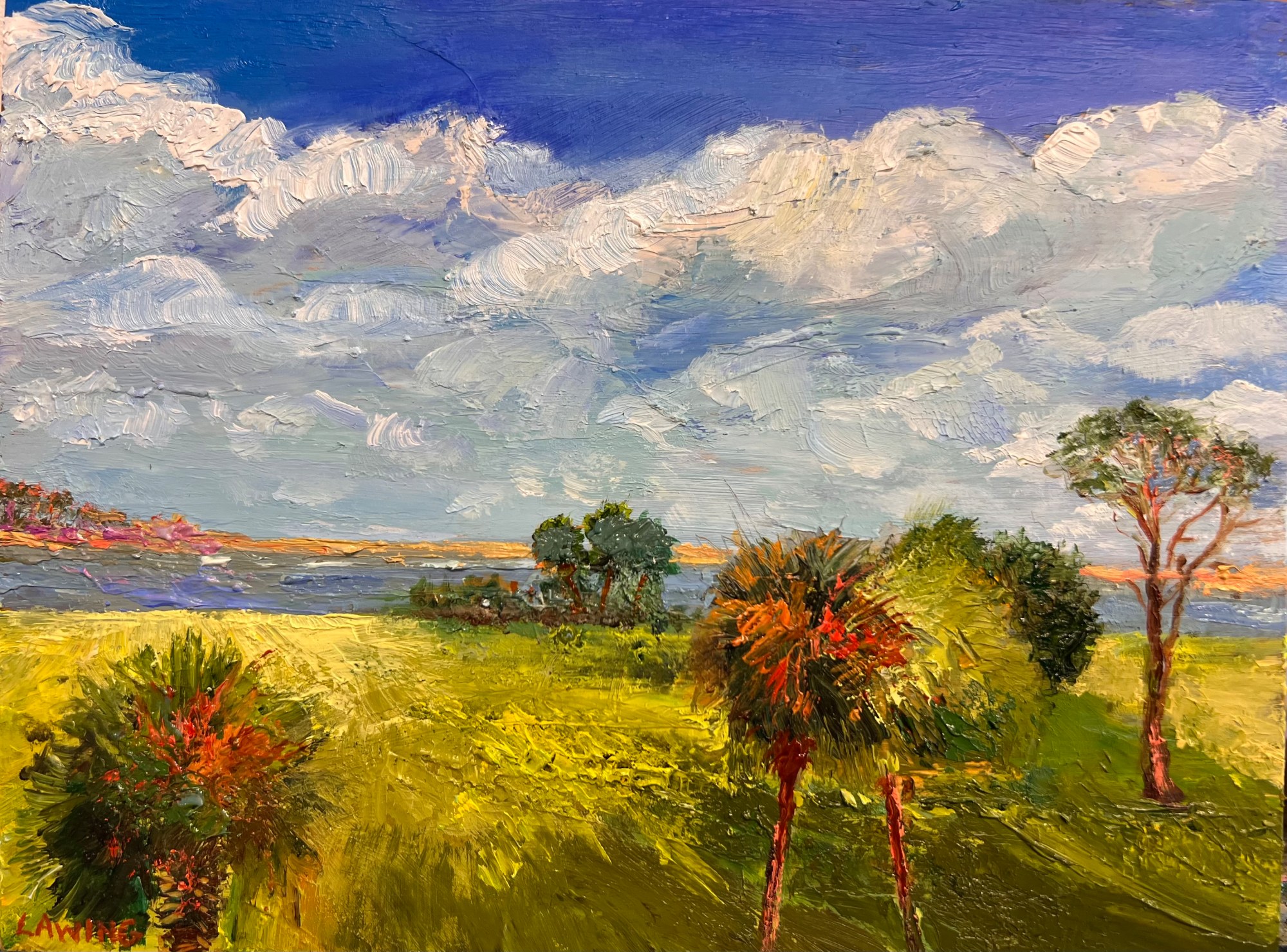Bird’s eye view of Fripp Island Resort’s Ocean Point golf course and Hunting Island. Fripp Island, South Carolina. Oil on cradled wood panel.