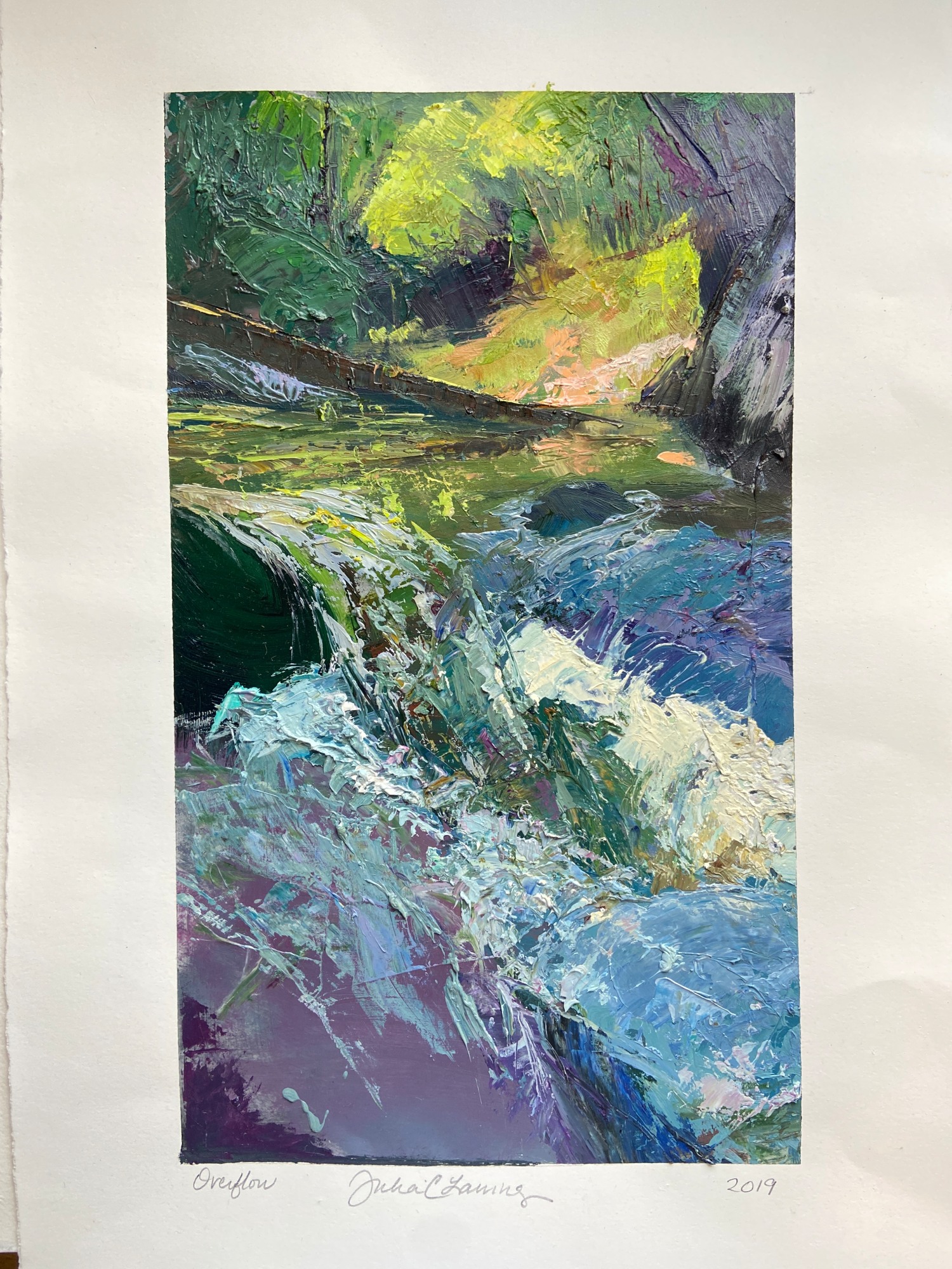 Rapids surrounding a fallen tree. Appalachian inspired. Oil on paper, beautifully matted and framed.