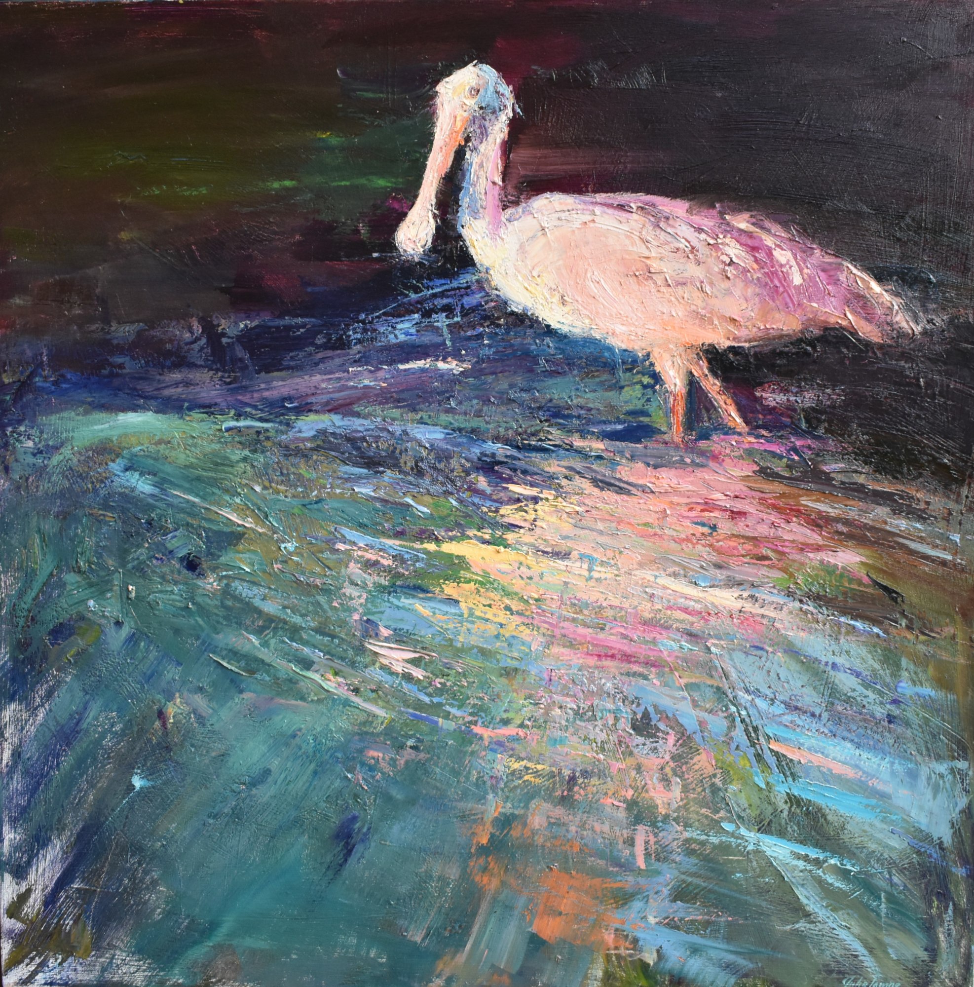 Roseate spoonbill and colorful water reflections. Framed in gold-finish wood custom floater frame; photo available upon request.