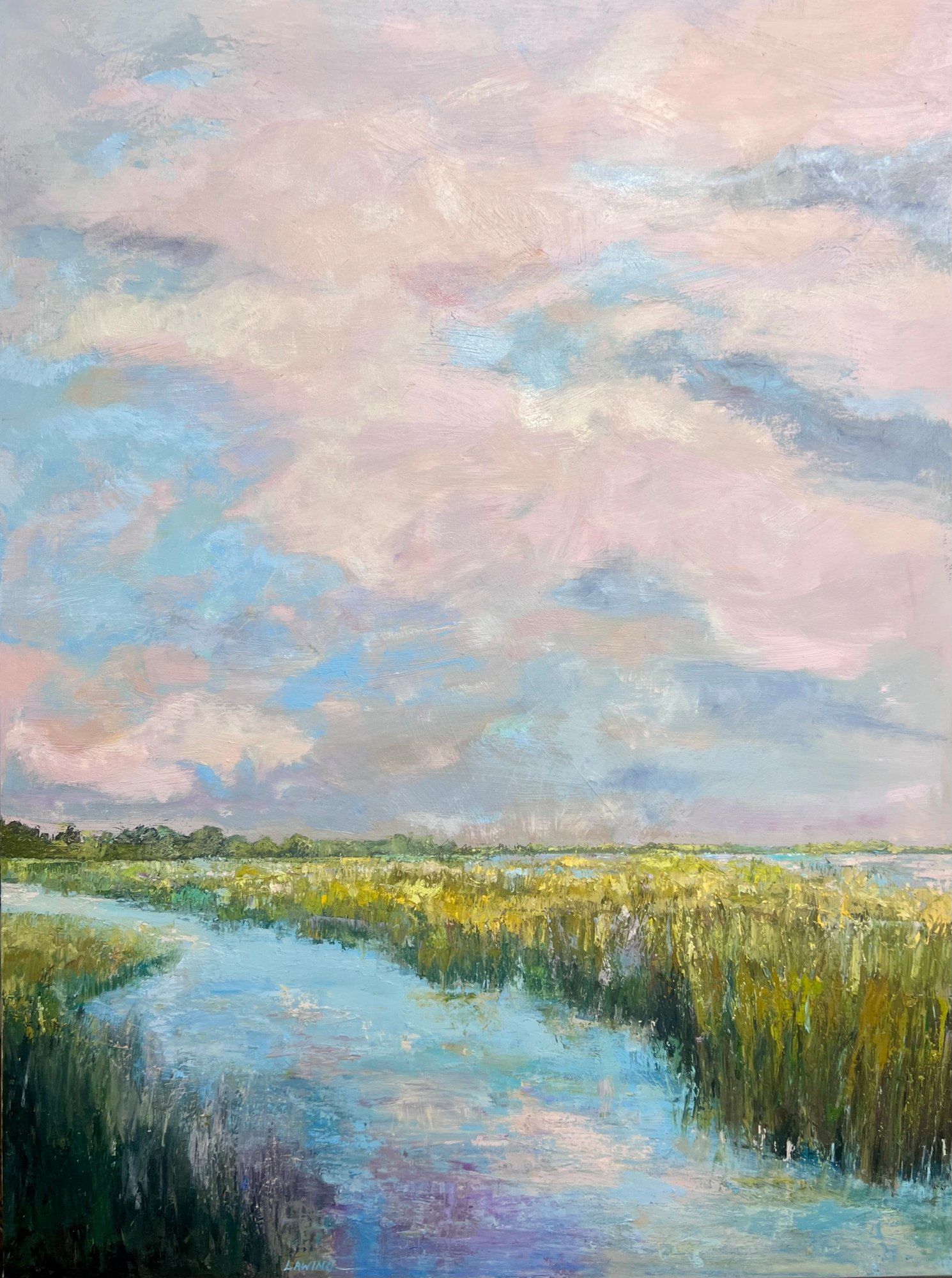 Inspired by the marsh view in the neighborhood my oldest daughter once lived in while in school at College of Charleston, near the Citadel. For this piece, I used a softer palette with muted blues, yellowy greens, warm white and peachy pinks. 48x36 inches, oil on gallery-wrapped canvas. By Julia Lawing