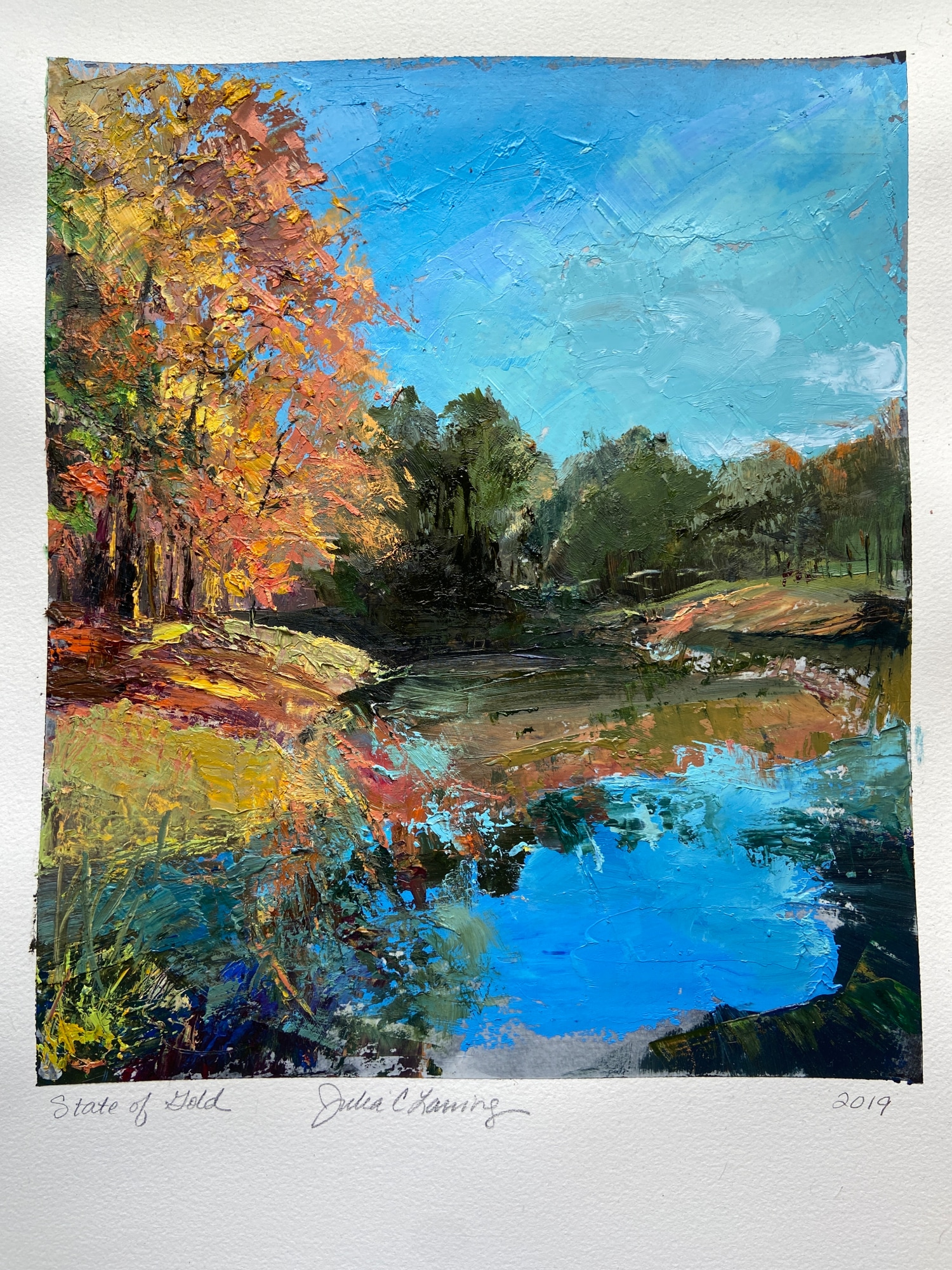 Colorful lake reflections on a gorgeous autumn day. Oil on paper, beautifully framed and matted.