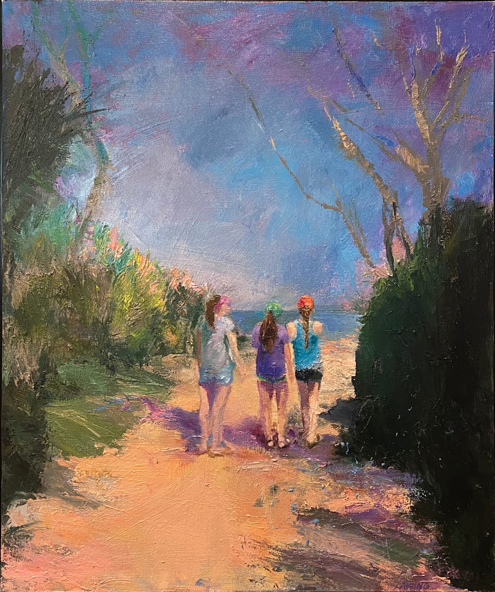 Three young ladies head down the path towards Driftwood Beach. Oil on canvas, framed in custom gold leaf floater frame.
