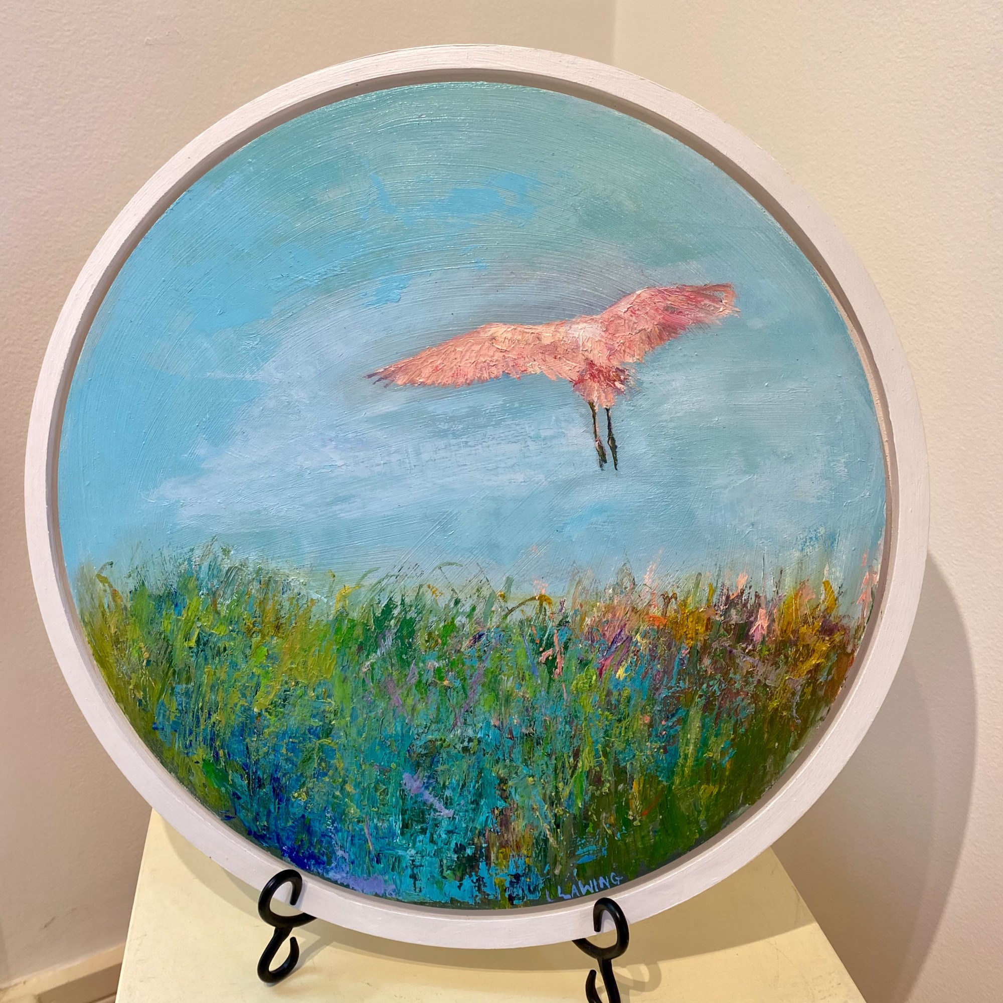 Pink spoonbill flying high in the blue sky above the spartina. Oil on wood panel, 17.5 inches across, ¾”-thick Baltic birch.
