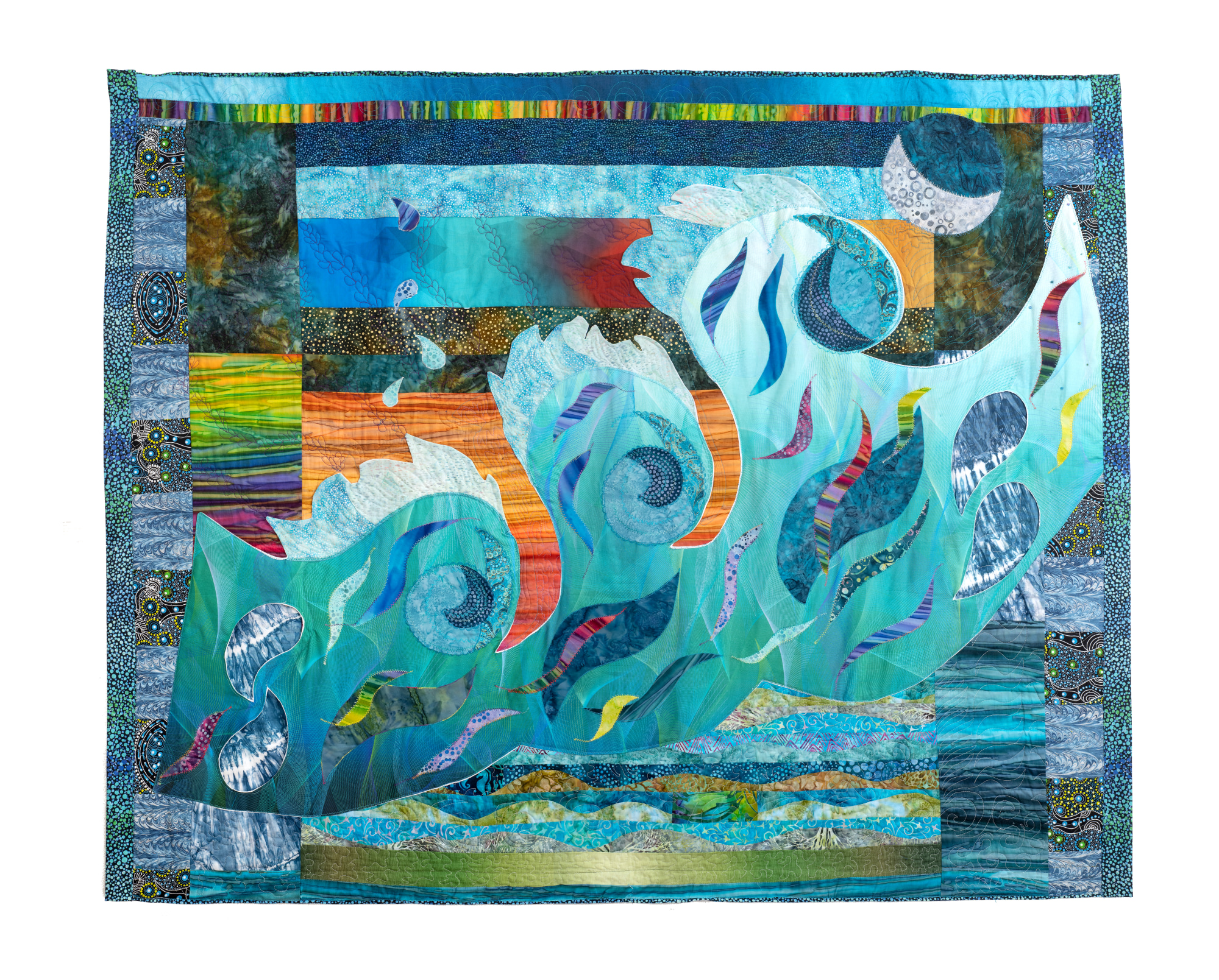 Careful observation and respect for the ocean's tides and currents is a wise approach for life on our entire planet. Here shown is an oceanic scene of waves gracefully reaching up to touch the sky. Attached in three layers made of hand-dyed and screen printed cotton fabrics. Here is a surreal, oceanic scene of waves gracefully reaching to the stars. In the making of this fiber art piece, Julia was inspired by the state of our local beach environment, in Monmouth County, and a poetic verse from Virgil's Aeneid. Detail work is top stitch embroidery, appliqué, and hand beading.