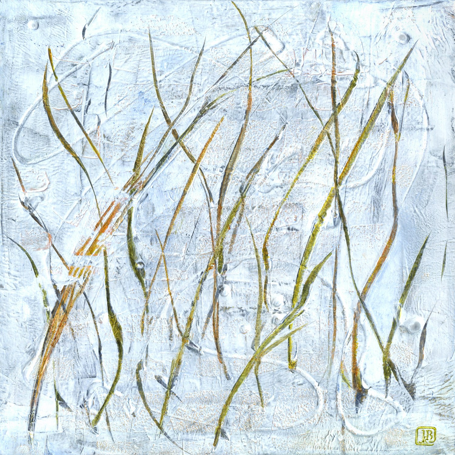 Gesso, collage (hand-printed tissue paper), acrylic, on cradled wood panel