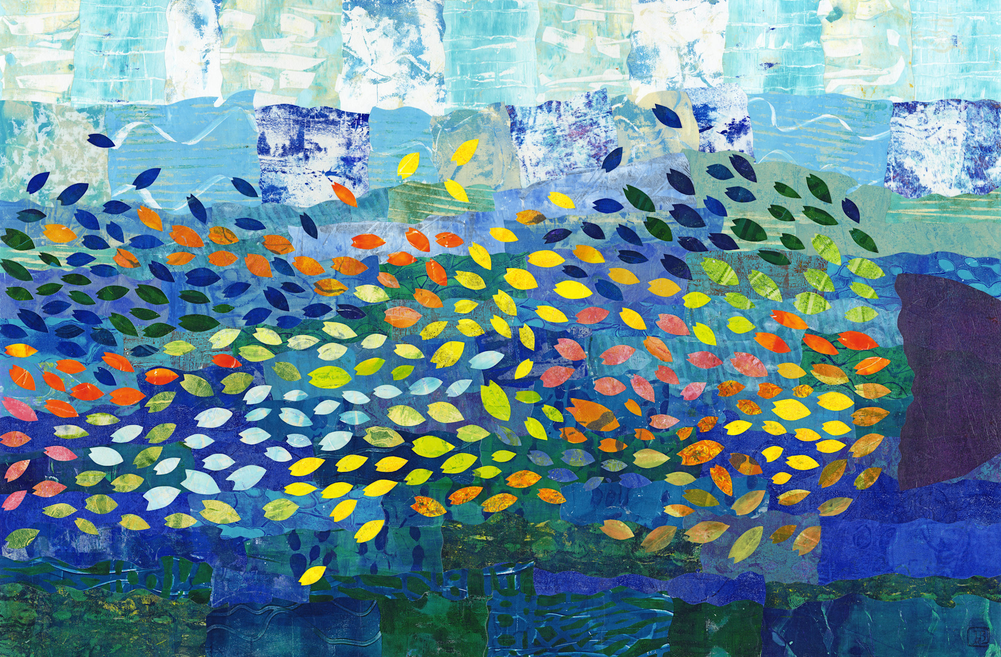 We Are Many offers a vibrant and dynamic view of the courage, community, and power of many against the power of one. It reflects the unity and excitement among the smaller, colorful fish as they confront a larger, shadowy fish to send it on its way. Using collage of hand-printed papers, the artist shares a new take on the old theme:“Organize!"