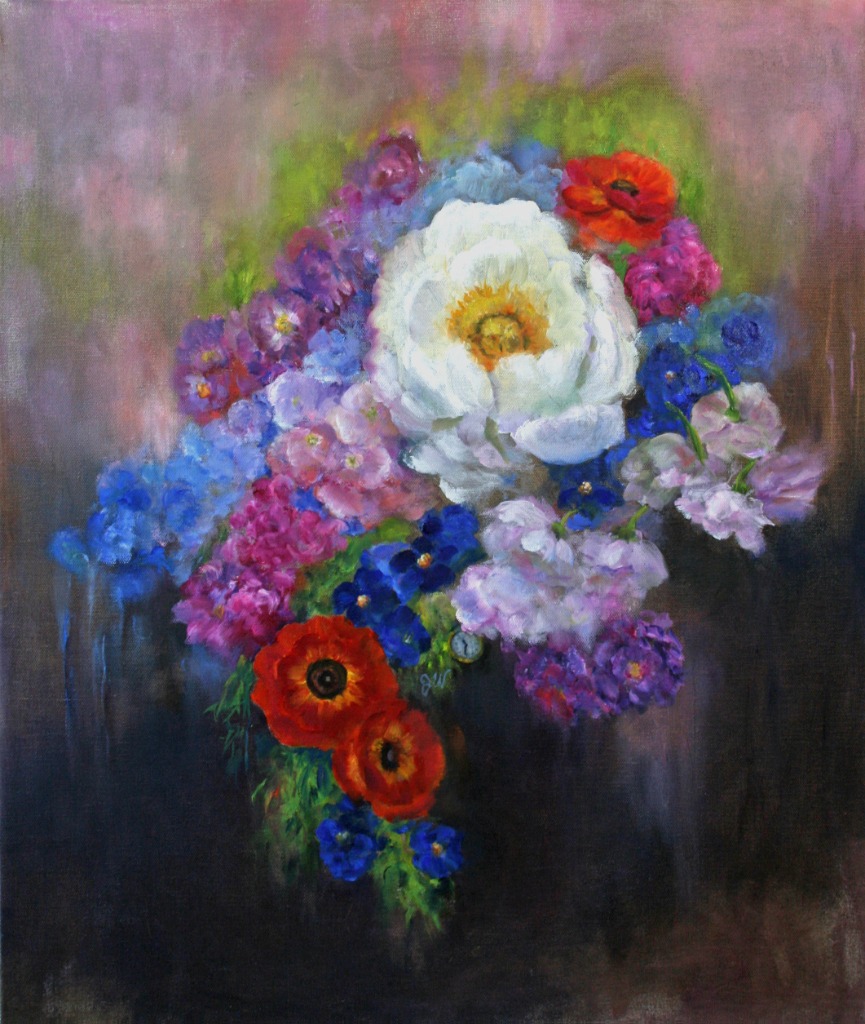 I love the colors here! I decided to let the underpainting show through in the background, and make the top fade off into pastel colors suggesting daybreak. Maybe the dawn of a new day!