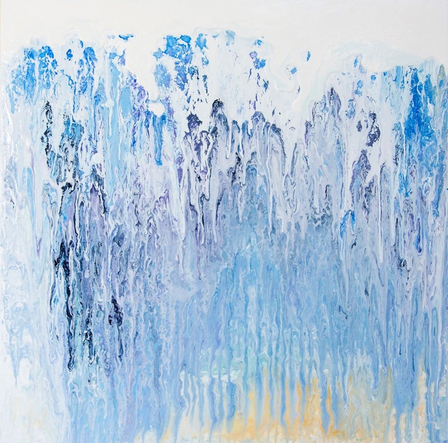 Abstract wall art - 36X36 acrylic painting with metallic accents - colors of blue and purple with tones of gold and silver resemble ice. Absolute Ice - Off the Grid Series of paintings by Julia Ross features artist's travel experiences - away from the life of the ever present.