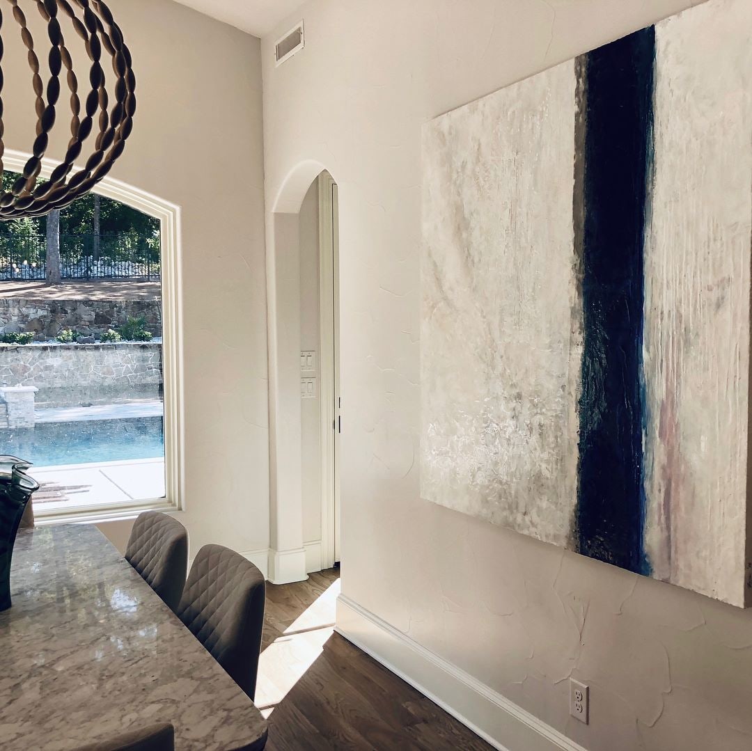 Encaustic on Board - Commissioned Artwork requesting custom colors with subject of Family - titled Family Legacy by the artist Julia Ross. The painting includes a view of stone created with encaustic bees wax on board, includes metallic elements - textural painting.