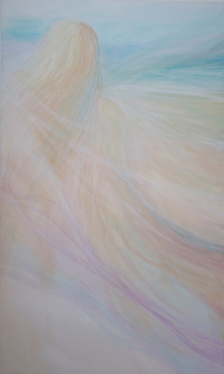 This ethereal ocean painting inspired by a walk on the beach, extremely delicate and light in a way that seems too perfect for this world, breeze flowing through your hair and clothing, illuminated by the late afternoon sun. Feet grounded in the sand, swaying with the breeze, meditating in sync with sounds of the waves and sight of the beach, in awe of the ocean. You are at peace.