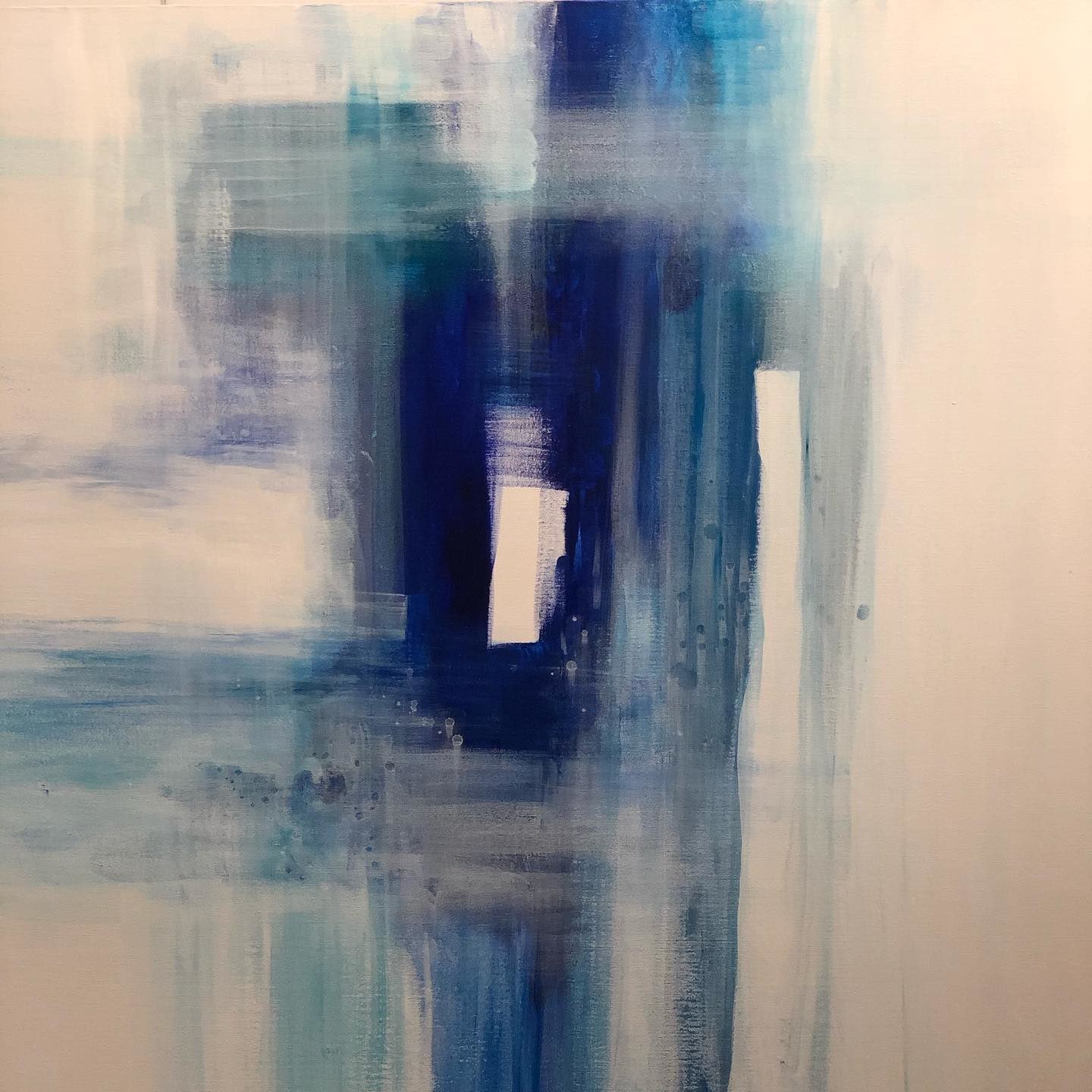 Abstract representational city scape includes a pop of bright blue – The 2020 Design Colors of the Year – Deep Blue and bleached coral represent colors viewed in a daily morning meditation by artist Julia Ross. The colorful painting includes aqua, blue and turquoise surrounded by white.