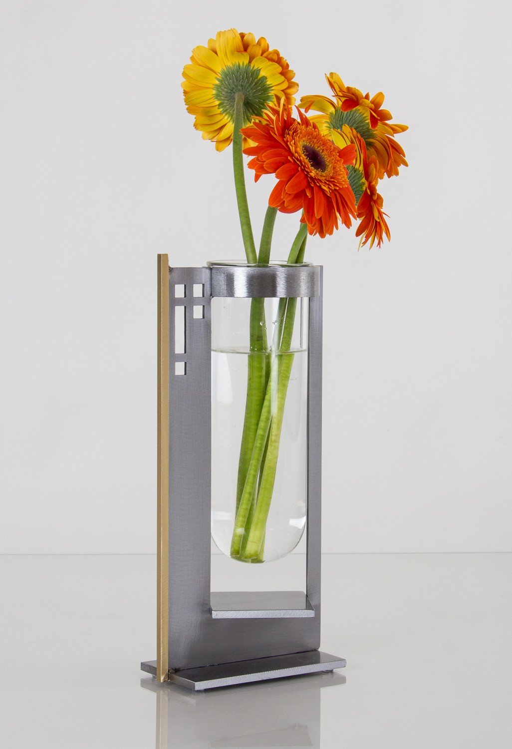 Our Finestra (window) FLW Bold vase is a handsome structure of steel and brass that cradles a 3" x 8" glass vase and your favorite flowers. Be Bold!