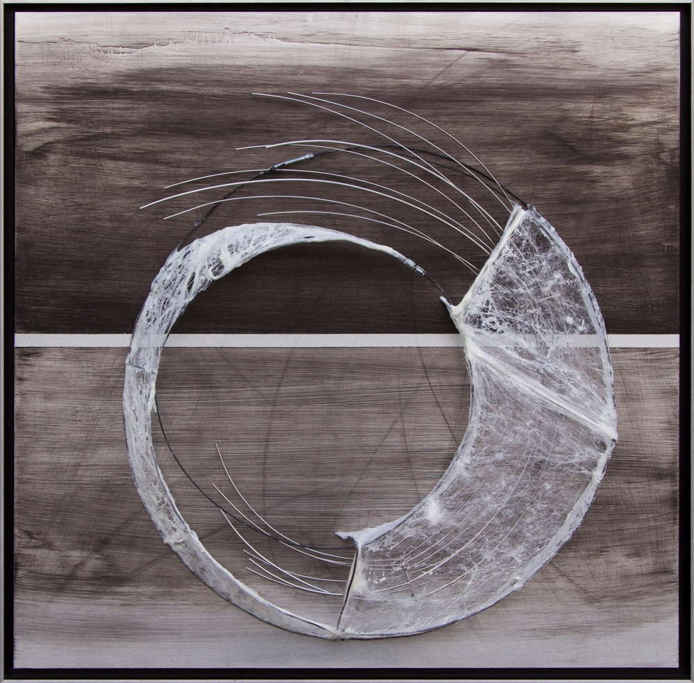A sculptural steel element that is shrouded in silk and encaustic. The steel seems to explode like a star going nova, filled with energy and light.