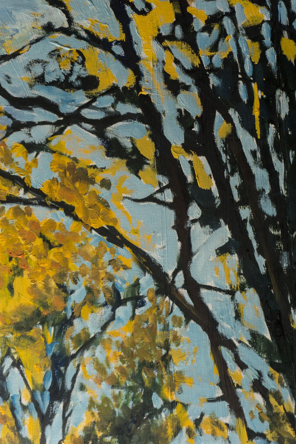 I love trees. Especially in the winter when their bones show and the roots poke through the dirt and moss. What I love painting however is the negative space between the branches. Look closely. The work is about the open space between the simply executed branches. The movement of the light and air when a wind blows and changes the shapes. Or snow. Snow rewrites the openings and reshapes the roots. Really love trees.