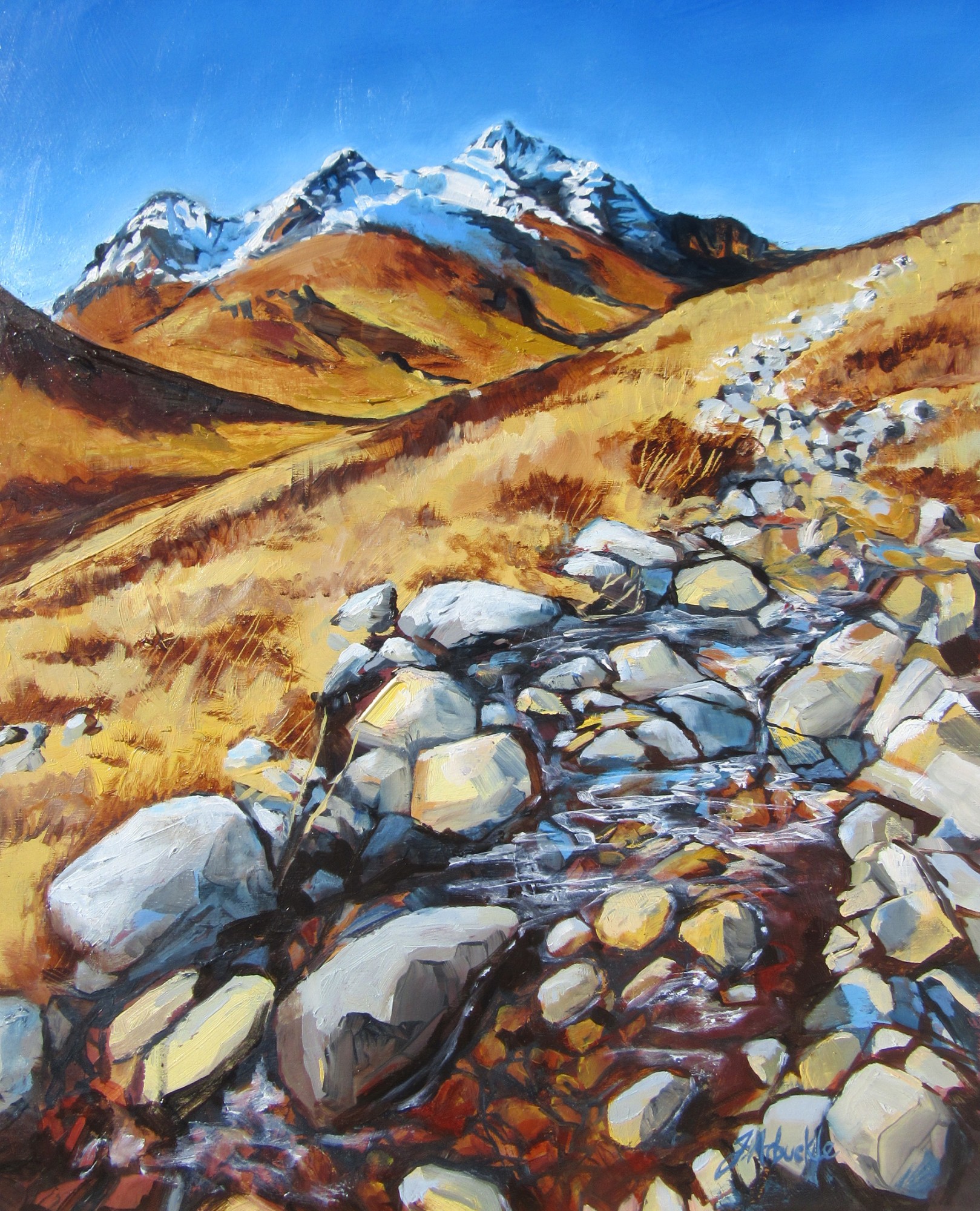 Landscape painter working in oils and mixed media : semi-abstract, working on metal and using maps and sketches in unique ways.