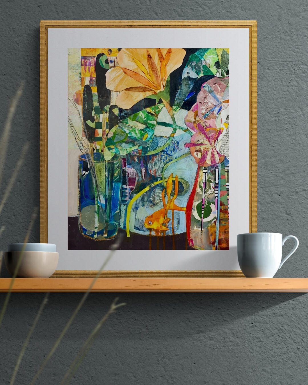 In this busy, overgrown still life, a single goldfish swims among a riot of color and texture.